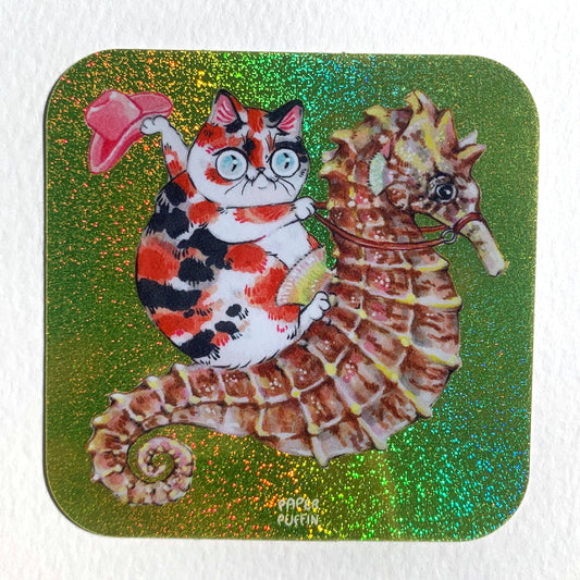 Vendor:Paper PuffinPaper Puffin - Cowboy Cat Seahorse Glitter Sticker
