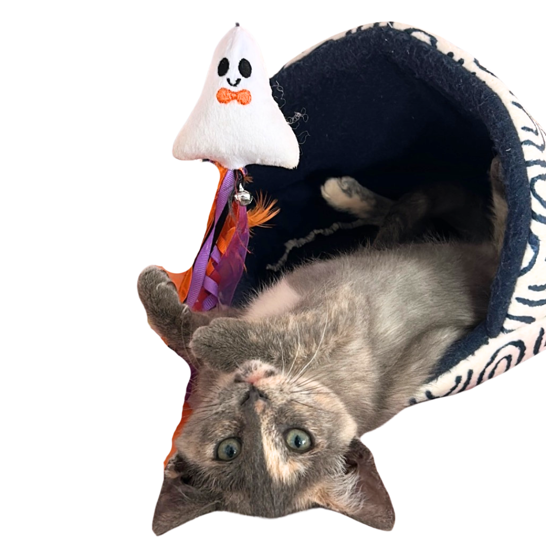 Adopt Witch TrialThis sweet girlie loves to have fun! She'll spend all day chasing her springs, running through her tube tunnels, and wrestling her foster brother even though he's double her size. If you stick our your finger, she'll come up to you and start giving kisses. She loves her cheek and booty scratches. Witch Trial has a tiny little meow which is so cute and unique. She would do best in a home with other cats and tolerates dogs.