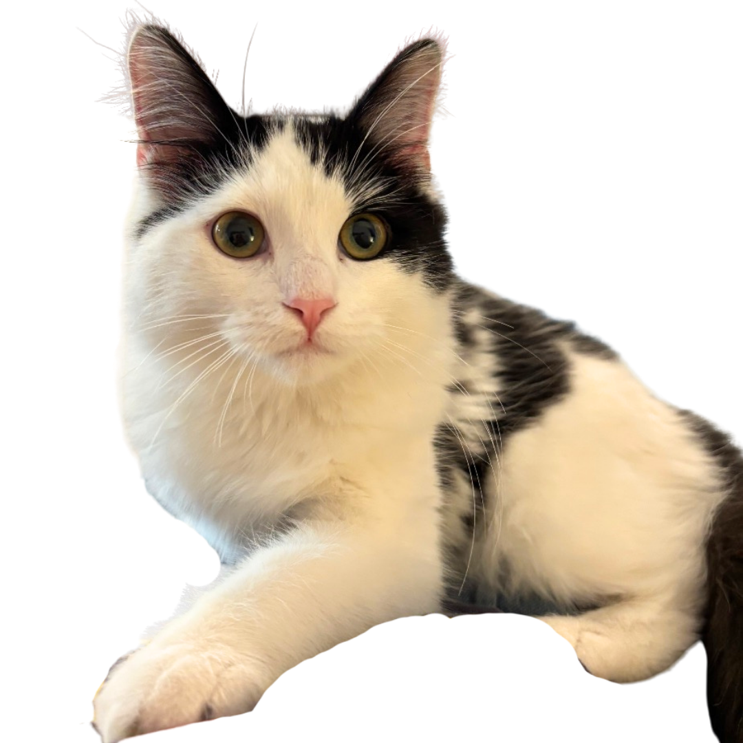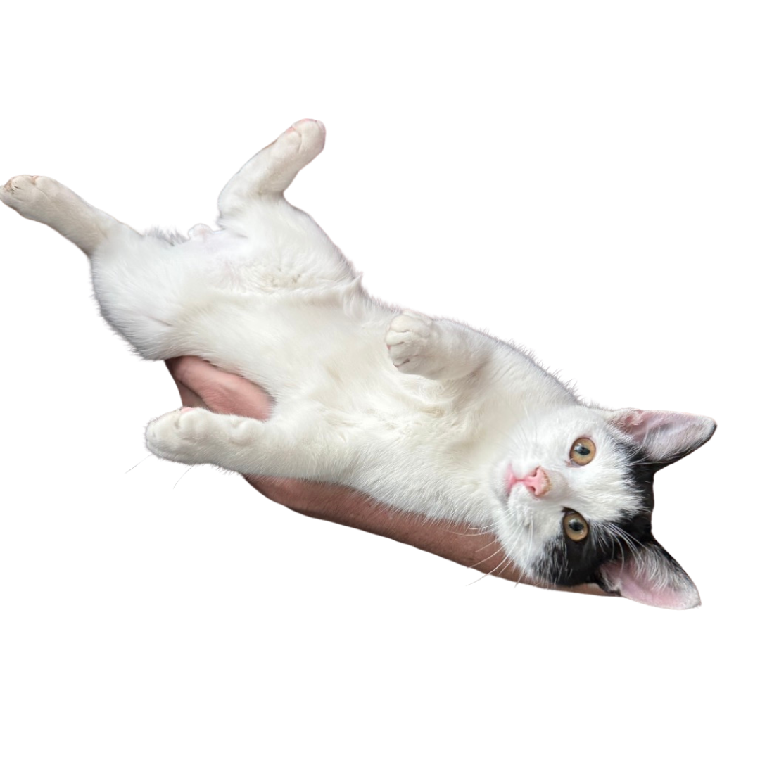 Adopt ManchildOriginally named for the Sabrina Carpenter song, Manchild has grown into his name. He is quite the needy baby boy. If there is a lap available, he will be laying in it. If you're on the toilet, he'll be reaching under the door to try to play with you. If you're working from home, he's going to ask for attention and assume that you're talking to him while you're talking to your coworkers in your virtual meeting. Manchild adores playing with catnip toys and his sister, Juno. Manchild isn't 100% sure about dogs just yet, but he may be OK in a home with dogs. He would do well in a home with little kids because he is very unbothered by louf noises, petting and attempts to carry him. He would love to be adopted with his sister, Juno, or into a home with a playful and high-energy feline friend.