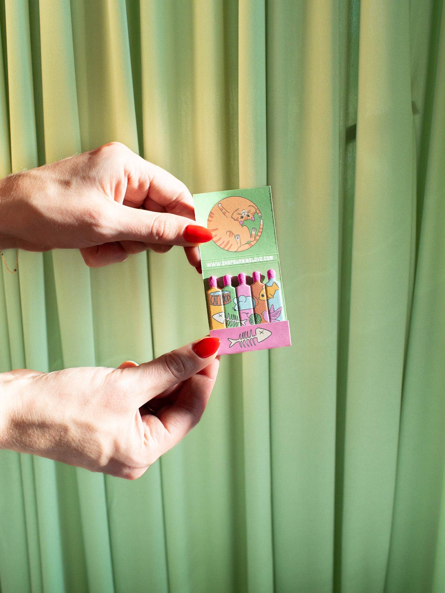 Adorable cat illustrations cover this matchbook, inside and out, even on the matches themselves! Comes with 10 matches. Drawn by the talented Claire Shadomy! Matchbook is 2" x 2.25" Please be careful when using this product and keep away from children! We can not be held liable for any accidents that occur when using this product. Made in Germany. Lighters/matches can NOT be shipped internationally. This design is the sole property of A Shop of Things and cannot be reproduced or copied for any reason without permission beforehand. ©