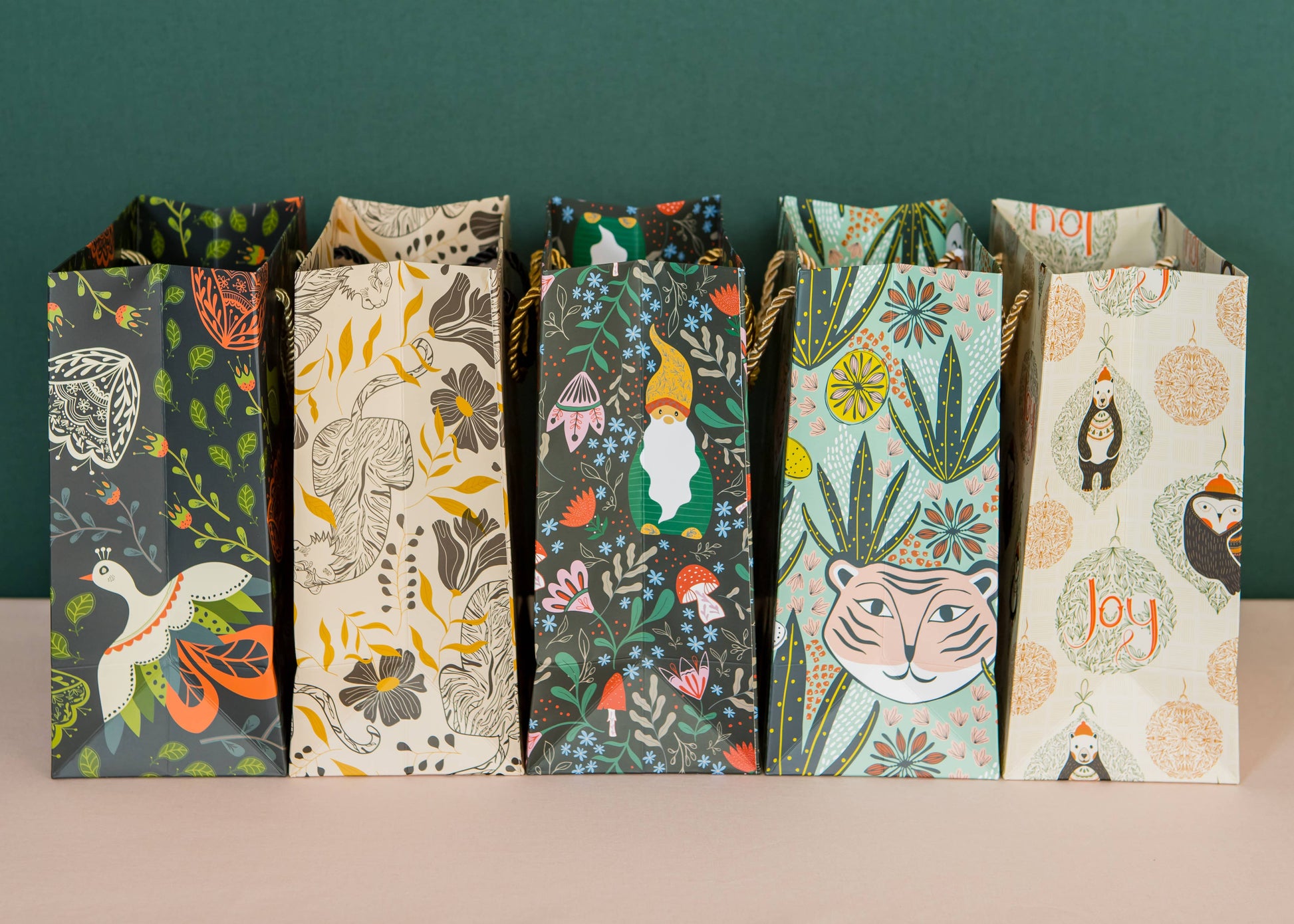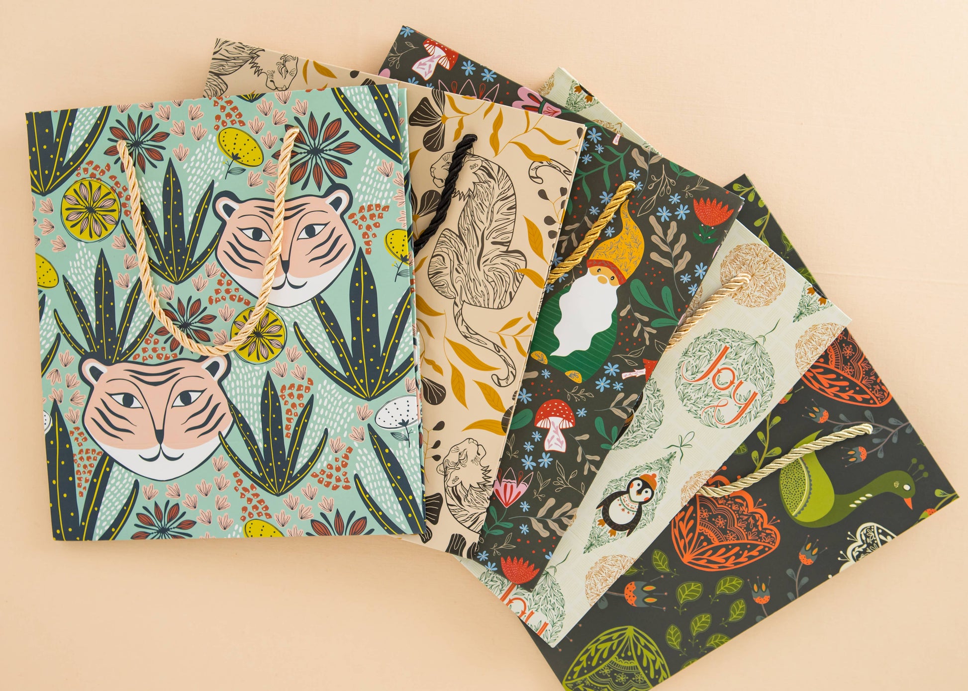 Made from heavyweight coated paper with woven cord handles, this premium bag is durable, reusable, and display-ready. Its detailed illustration and luxurious palette make it a standout piece on your shelves and a refined choice for animal-themed or modern collections. Part of the Tiger Tiger Collection with coordinating greeting cards, gift tags, and wrapping papers for a cohesive display.