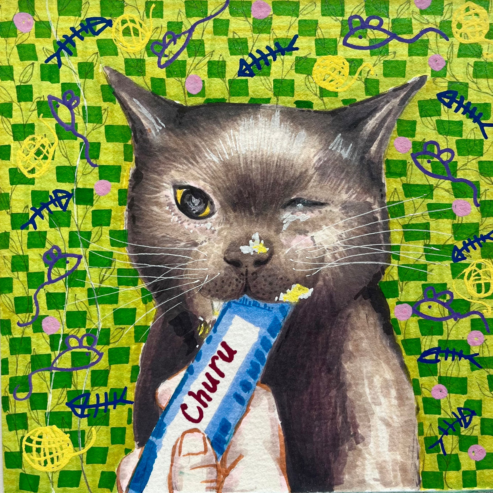 Artist Bio: My name is Emelyn, an animal lover living in Chicago. I love cats and occasionally like drawing with markers. This drawing is based on the sweetest photo of Baby (seen on her adoption page) where she’s really enjoying her churu treat!