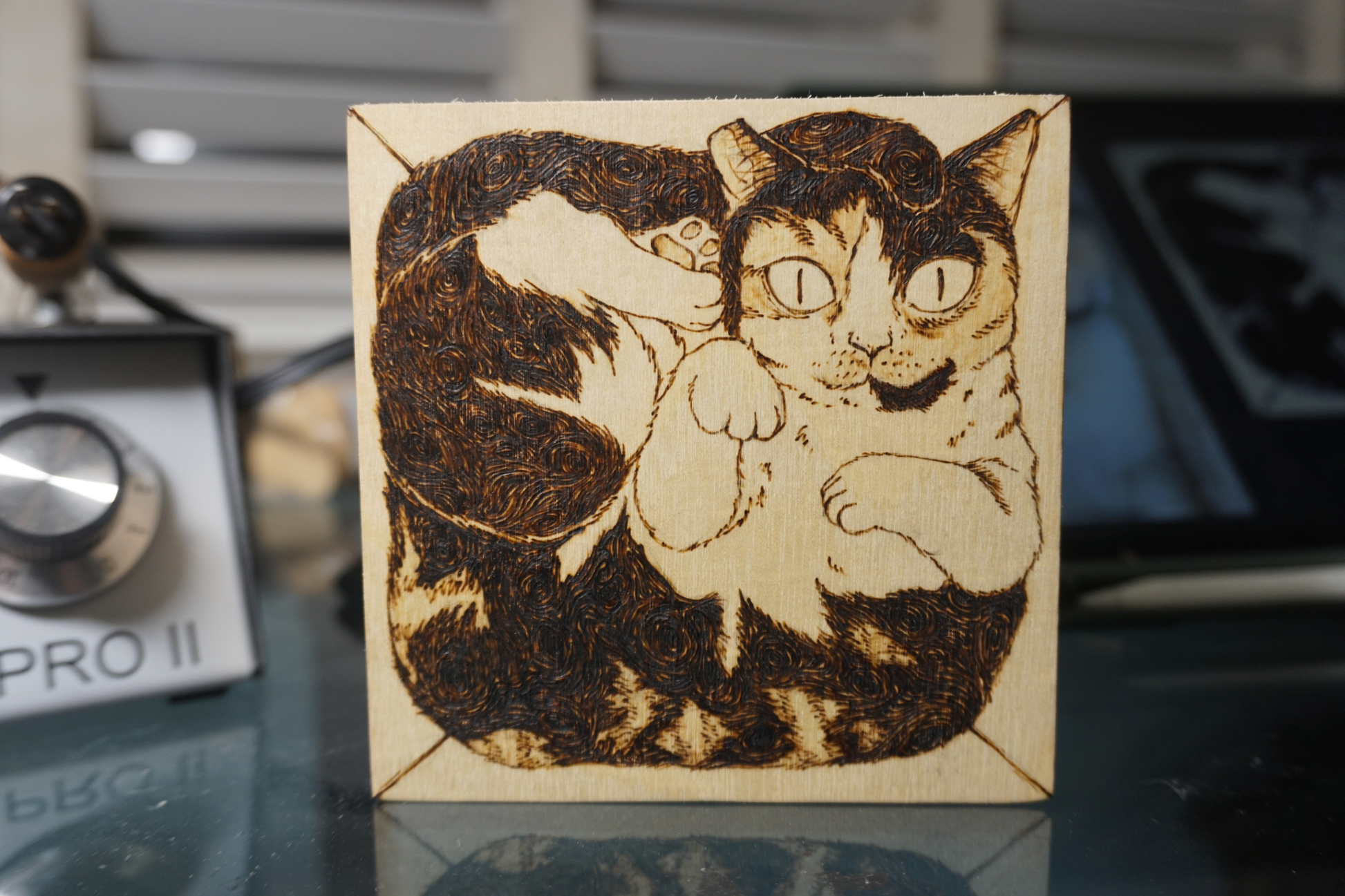 Original wood burned artwork by Niki Okimura, from Huntington Beach. 4x4 inch wood panel. 100% of the sale will be donated to TippedEars, the rescue that saved Baby Ruth! This sweet girl is still available for adoption and you can meet her in our shop (she's one of our foster kitties!) or find out more about her online here!