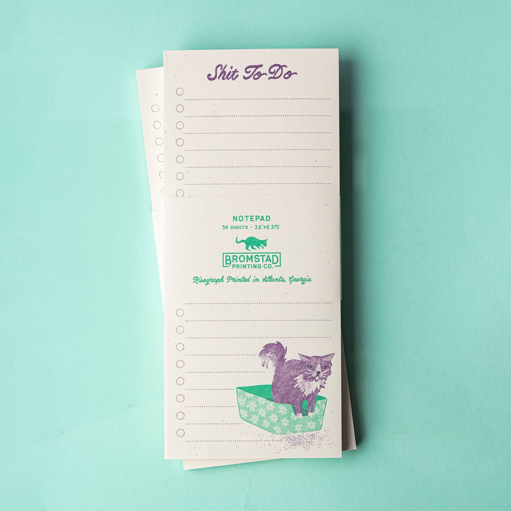Notepads! A grumpy cat does their business in a floral litter box. This charming to-do list notepad features 21 lines to detail all your business with 54 tear-off sheets on a chipboard backer. Risograph printed in seafoam green and plum purple. 54 tear-off pages 3.6"x8.375" Paper belly band packaging, no sleeve Risograph printed with eco-friendly, vegetable-based ink 100% recycled, FSC-certified paper.