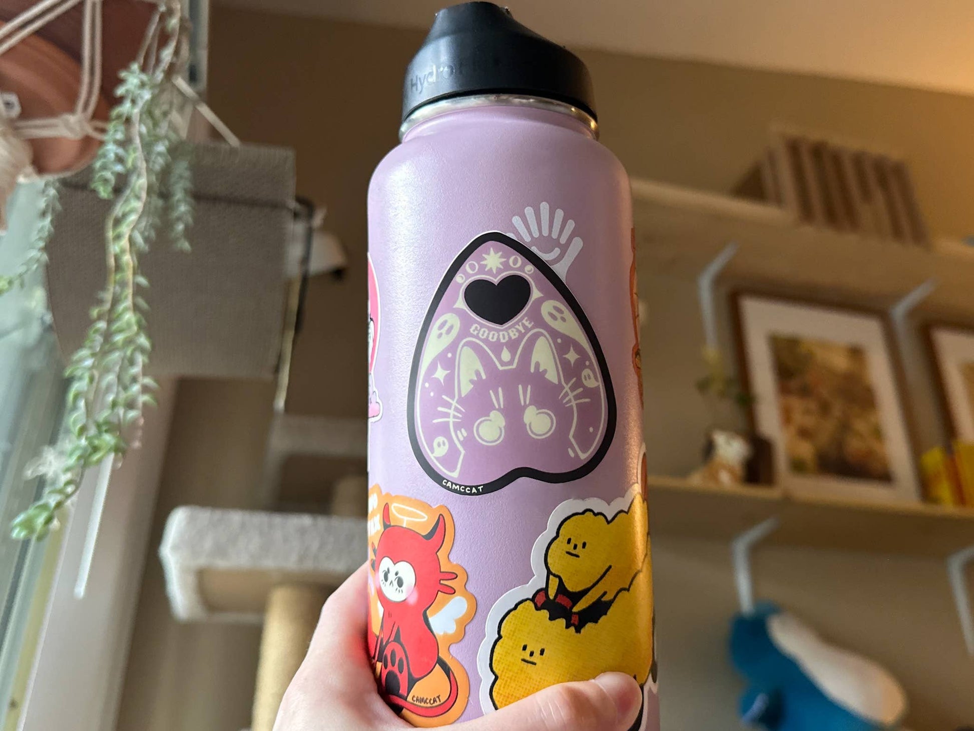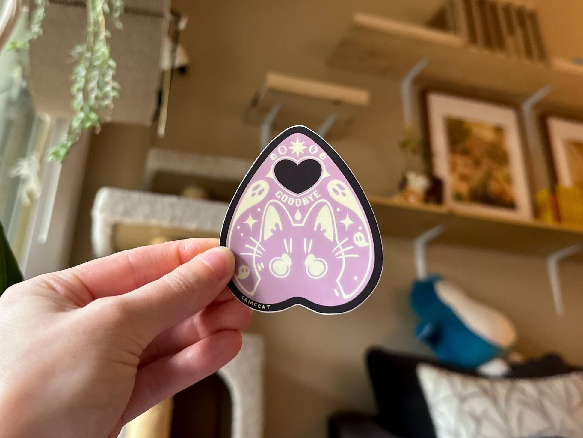 2.5in x 3in (approximately) - Waterproof matte vinyl - Original illustration This little cutie is an original illustration designed and drawn by me! They are printed through Vinyl Disorder, a California-based printing company. The design features a pastel purple planchette on a deep brown background. The planchette illustration has a heart shaped hole at the tip, and soft white details. It is decorated with a wide eyed kawaii cat, little ghosts, and the word “goodbye”. It is perfect for someone with a soft grunge, pastel goth, or cute spooky asthetic! These high-quality, waterproof, matte vinyl stickers should last 3-5 years in all weather ✨ The matte coating creates a unique-looking sticker that's never too shiny and shows the detail of the drawing clearly. They are perfect for water bottles, laptops, notebooks, or wherever else 👁👁