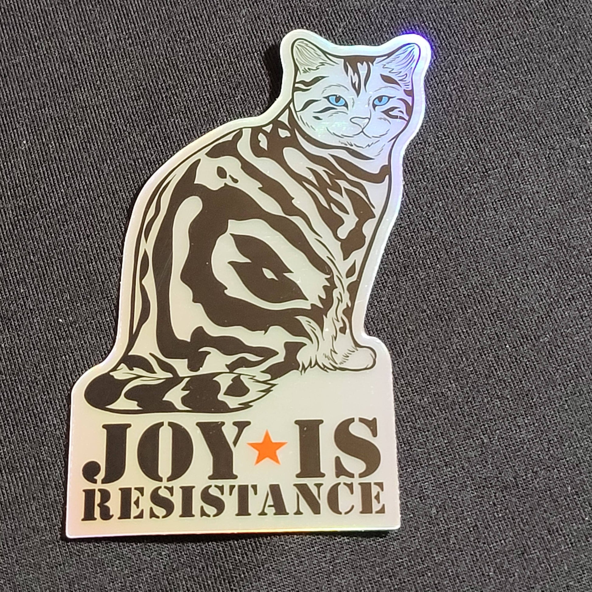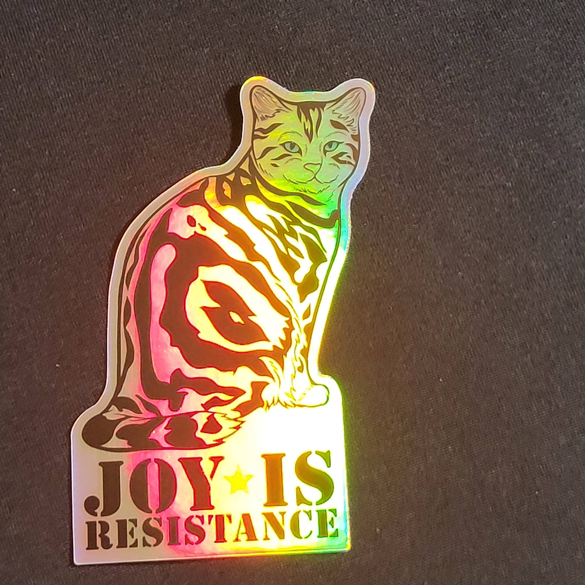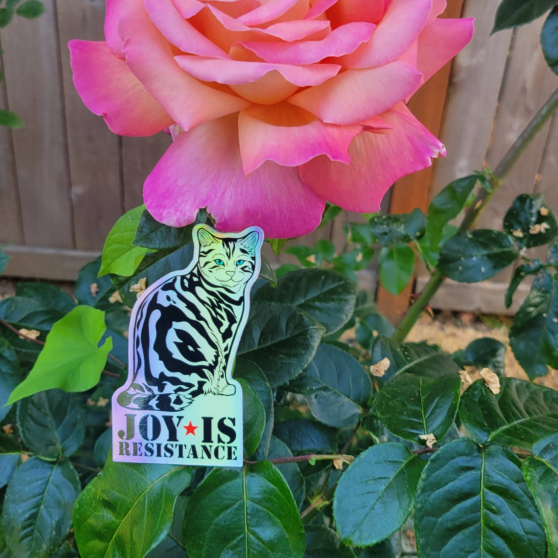 At Cat Champion, we believe in advocating joyfully and abdicating entropy. Our 'Joy Is Resistance' sticker, measuring 4", is a testament to that. Crafted with holographic vinyl, it is a reminder of self-care, inclusivity, and thoughtful indulgence. This vibrant sticker, inspired by our first and only true love - cats, is perfect for adding a touch of joy to any surface. Enjoy cats, enjoy life!
