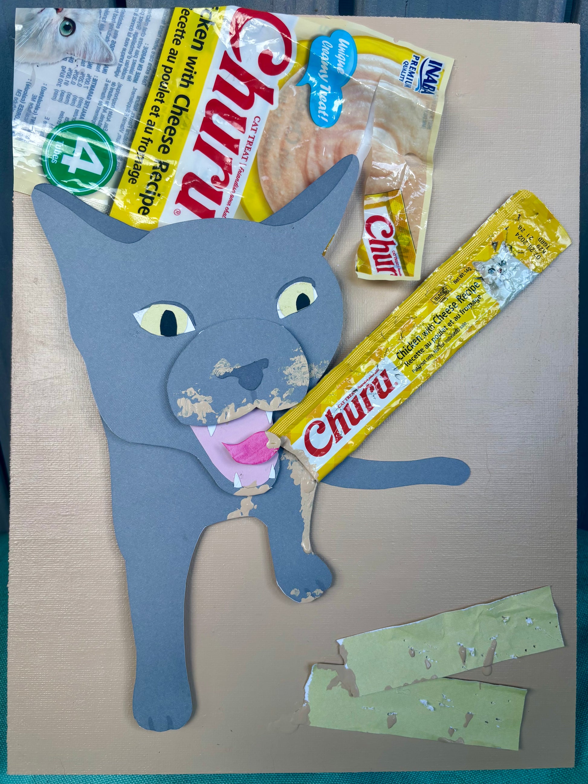 Artist Bio: Sam Rosen has been involved in the Long Beach cat rescue community for about three years and primarily volunteers with Tipped Ears. Sam made "The Churu Chainsaw Massacre" in honor of his community foster cat, Chainsaw, who he found starving under his neighbor's house. No cats were harmed during the making of this piece...but several Churu tubes were.