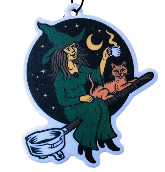 The Rubbish Rubbish's Witch and Cat on a portafilter coffee scented air freshener. Design by Death By Coffee.