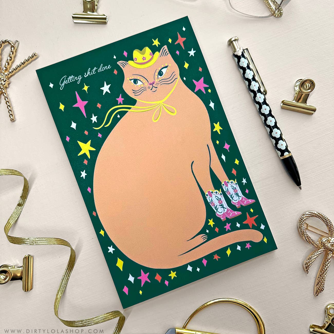 "Getting shit done." Cat Notepad illustrated and designed by Miss Scarlett. Size: 5.5 x 8.5" 50 tear off sheets.