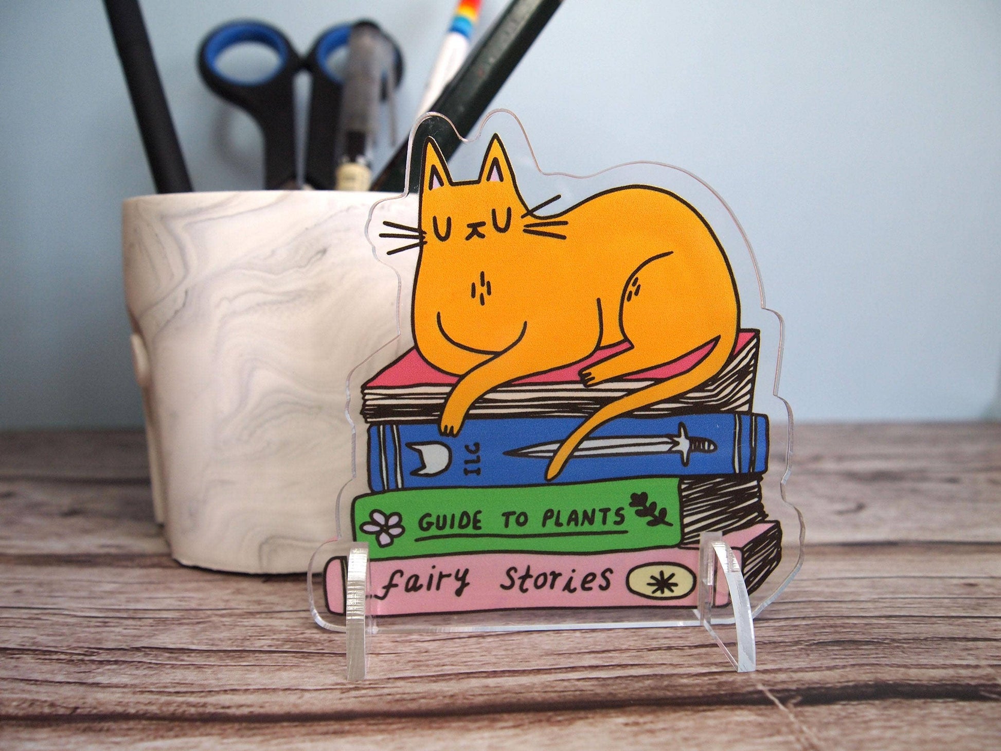 Created from my original illustration of an orange kitty sitting on a pile of books, the ornament has been UV printed onto clear acrylic before being laser cut. All you need to do is pop out the pieces and slot them together, and it will stand on your shelf, desk, windowsill or wherever you like to put your trinkets.
