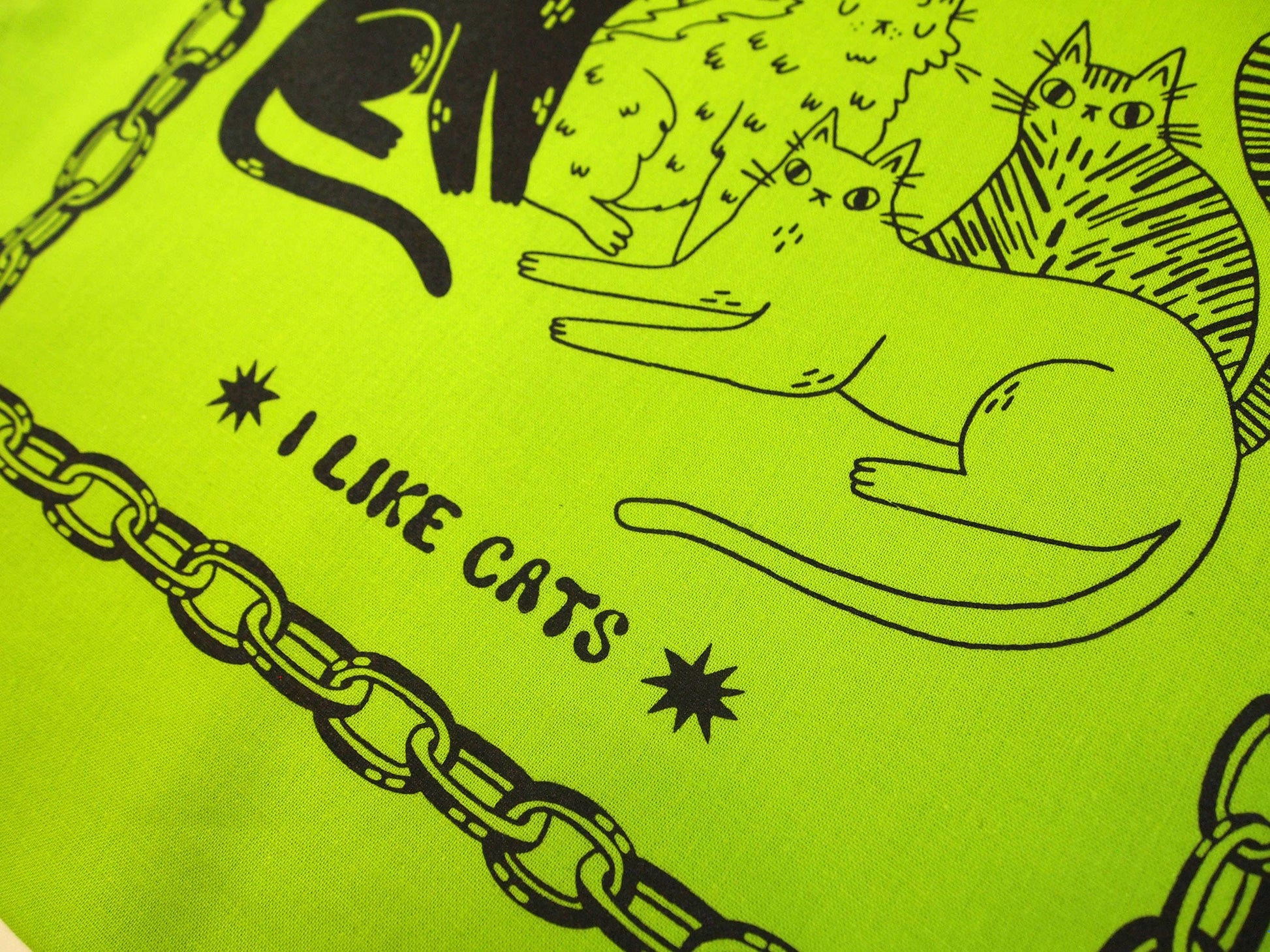 Featuring my original illustration of a cat gang surrounded by a linked chain and the hand drawn text 'ALL CATS ARE BEAUTIFUL' (very true!!), the design has been screen printed in black ink into onto a gorgeous brat green tote bag. I love all of the different characters of the cats, and the text at the bottom says 'I LIKE CATS'.