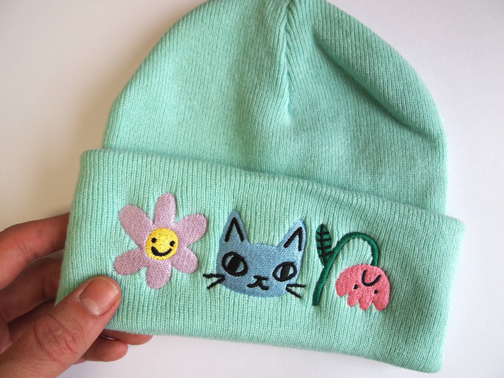 Stay warm and cute through the colder months with this stylish mint knitted beanie hat, embroidered with my illustrations of a cat with flowers. Theres a happy lilac flower and a sad wilting pink flower. The cat face in the middle is super cute and embroidered in blue thread, complimenting all of the colours of the hat and other motifs.
