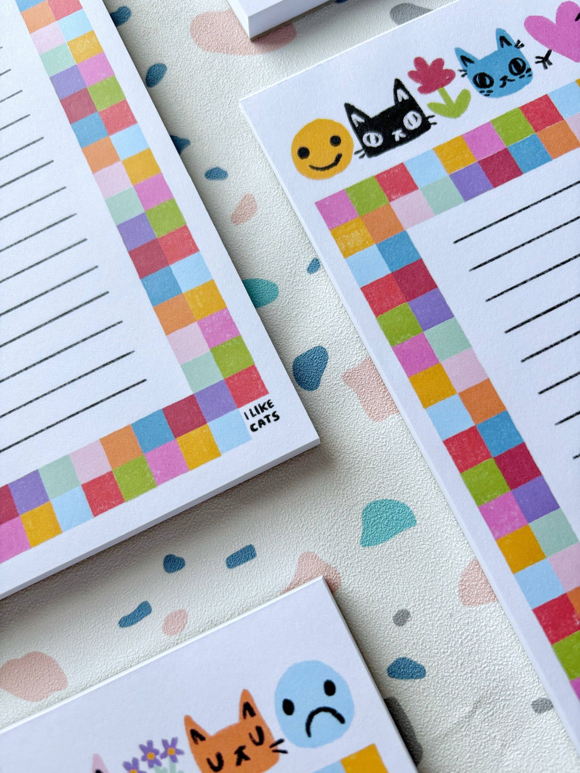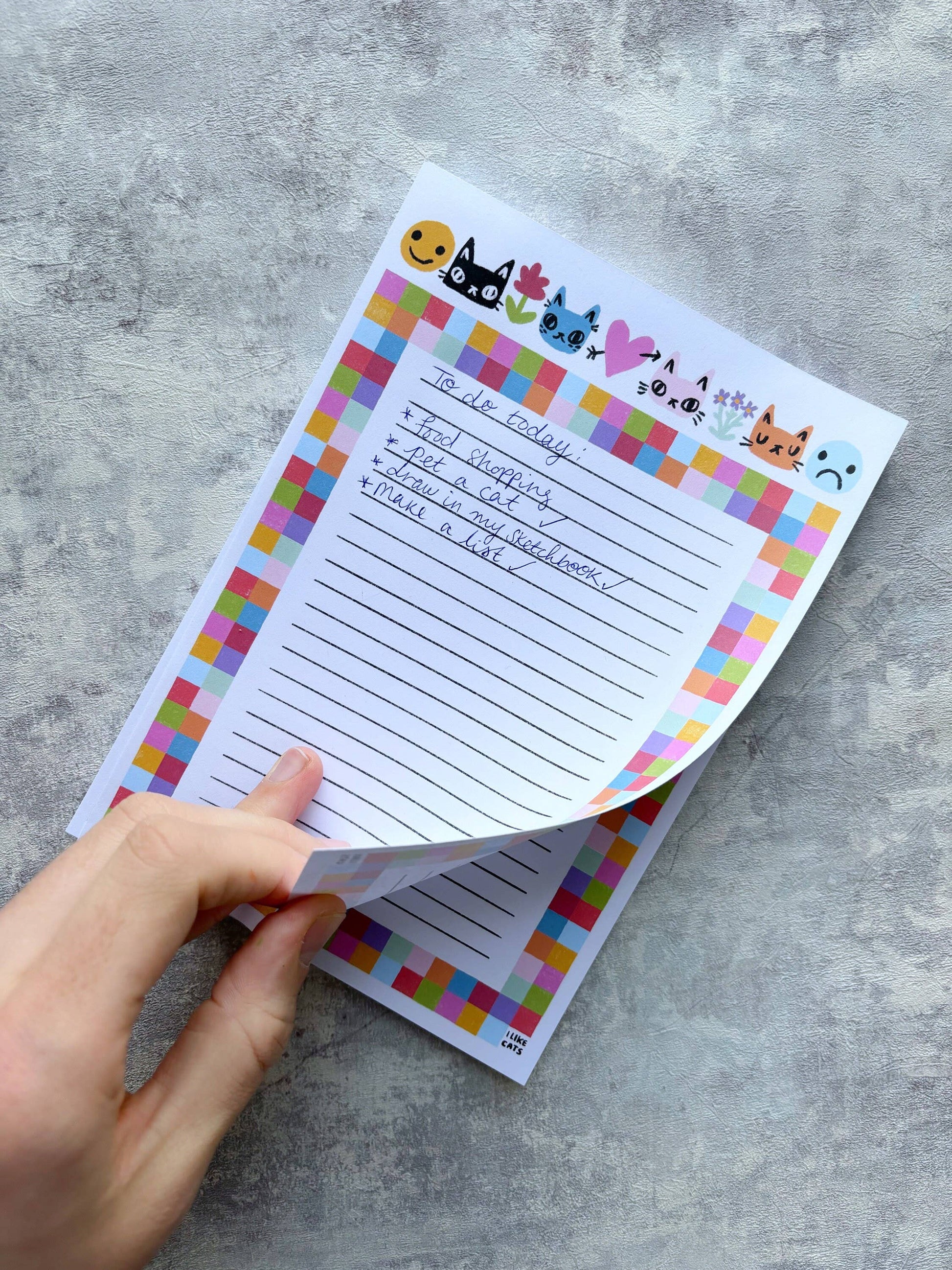This super cute cat notepad features 50 full-colour pages, ready to fill with notes and lists to your hearts content! The top of the page features my original illustrations - cat faces, smileys, flowers and hearts. Surrounded by a gorgeous bright and vibrant is all the lines you'll need to make your lists for the day. Perfect to keep on your desk for any notes while working, or also makes beautiful paper for letter writing or scrapbooking.