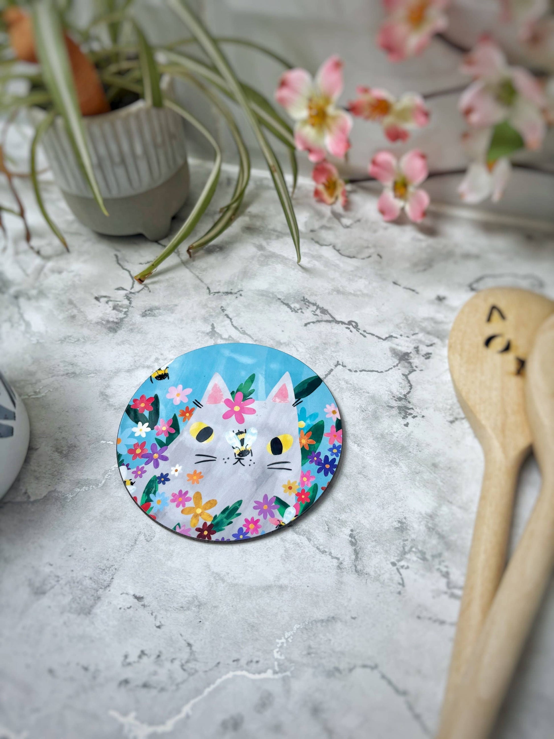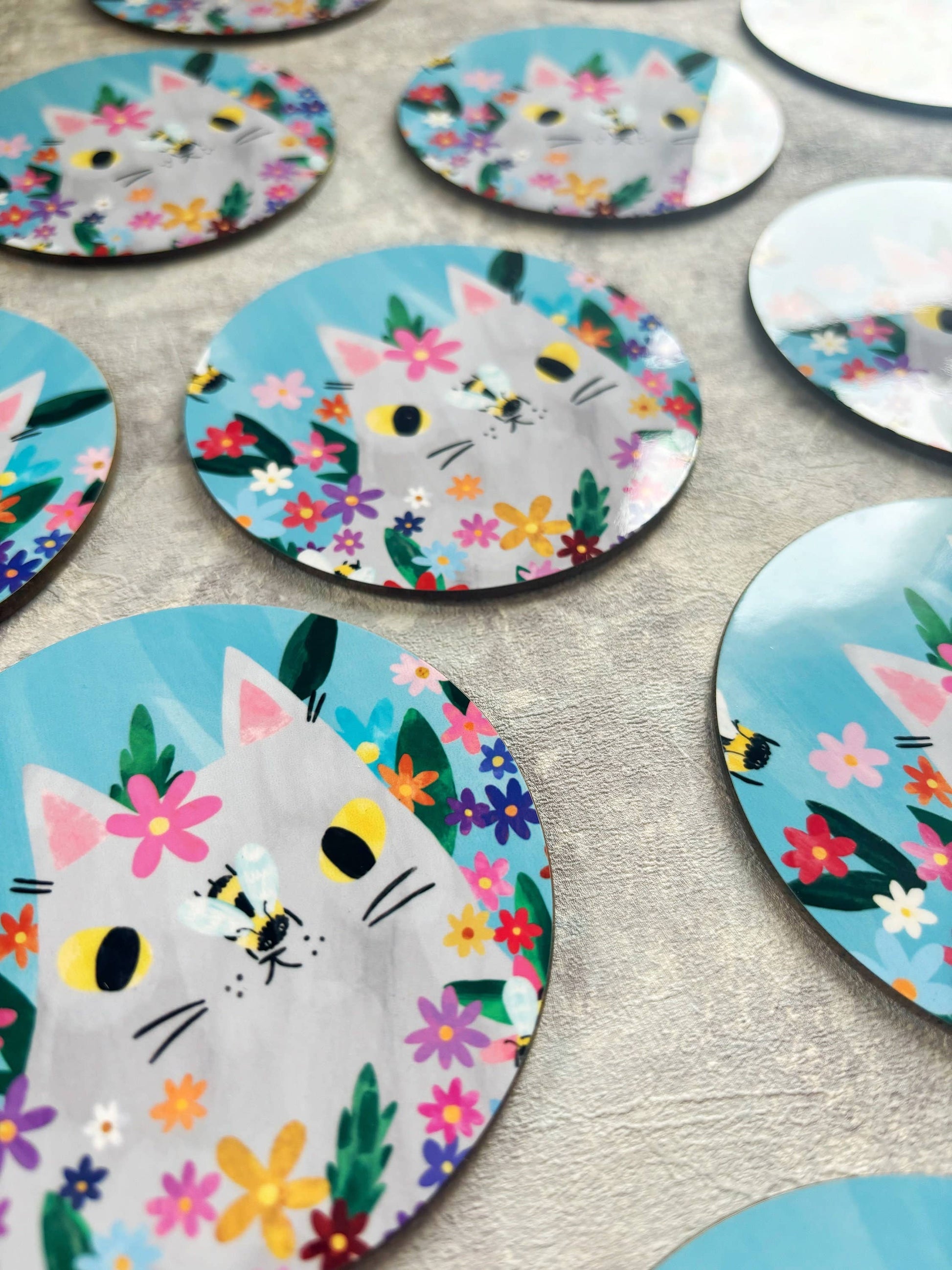 Cat with bees cat drinks coaster - cat gift, cat art, drinks coaster featuring an original illustration, these coasters are a fun and practical addition to any cat lovers' home! The illustration is of a sweet grey cat surrounded by colourful flowers and buzzy bees has been professionally sublimation printed onto a coaster, with a lovely gloss finish. They are really high quality and perfectly capture the vivid colours of my original drawing. The circular coasters are 90mm in diameter, and made from 3mm thick (approx) hardboard and come with a single-sided full colour print. A perfect gift for anyone who likes cats!