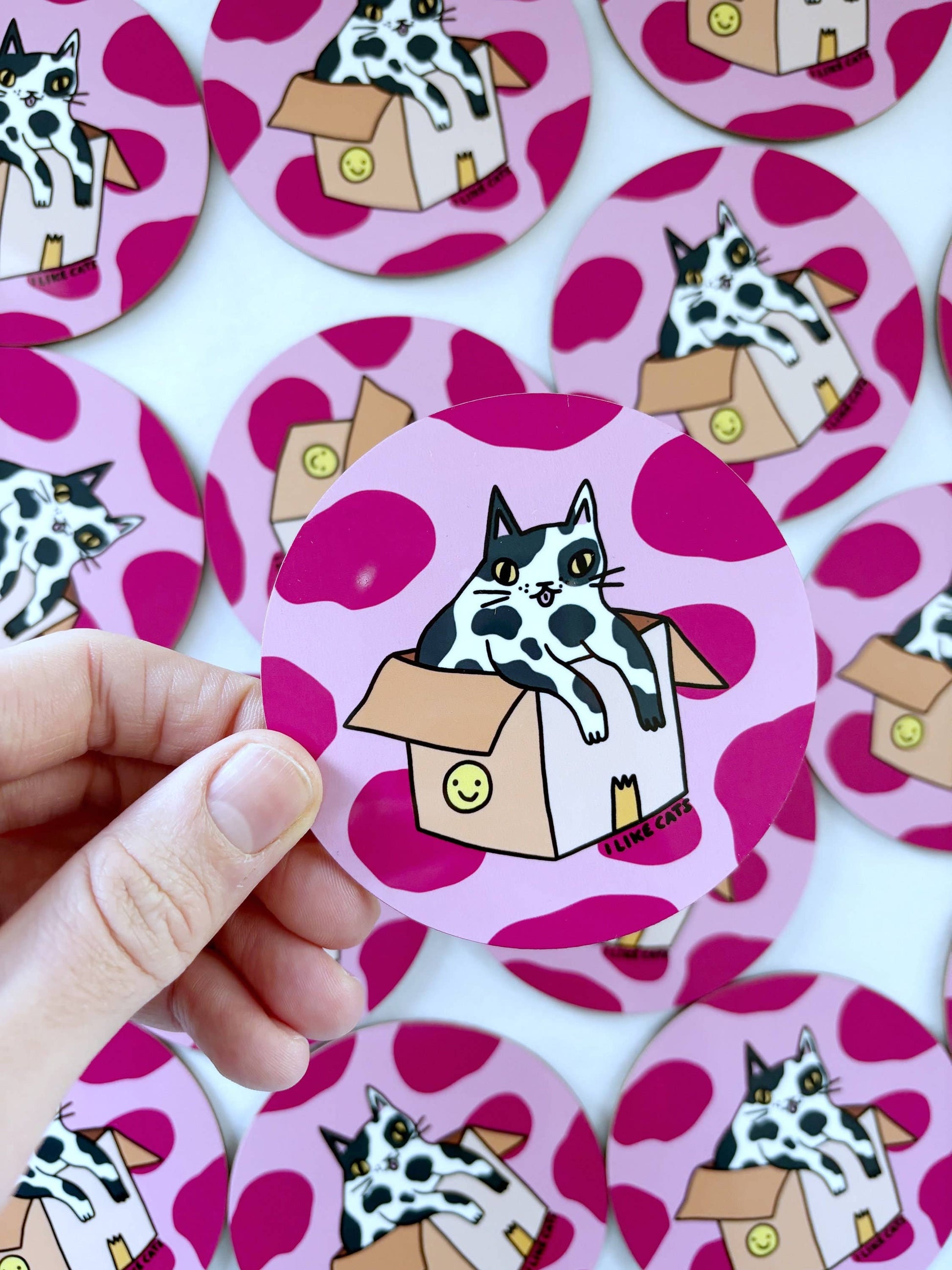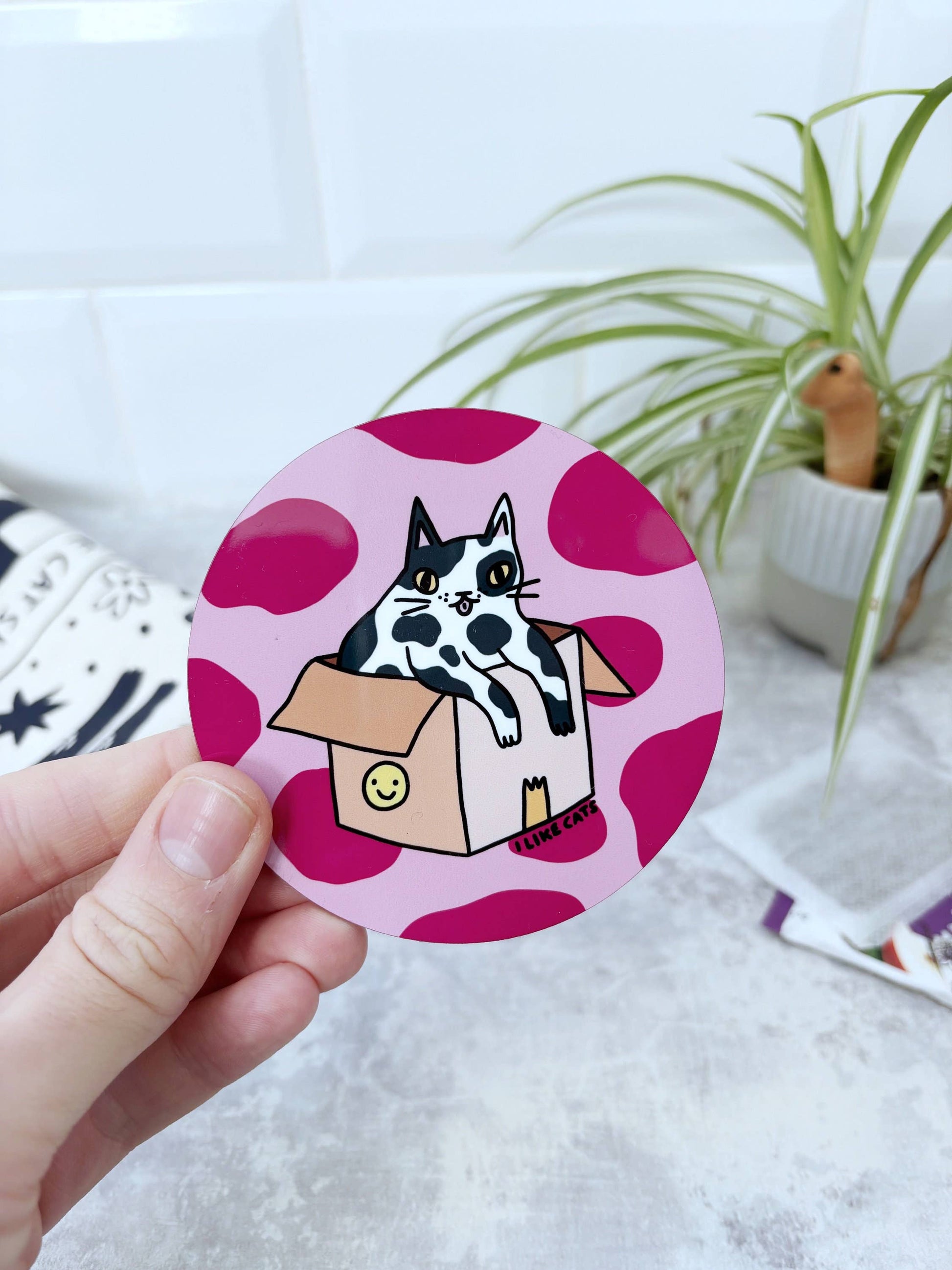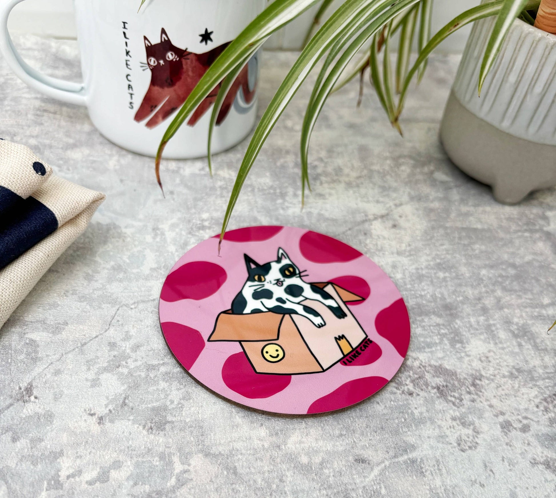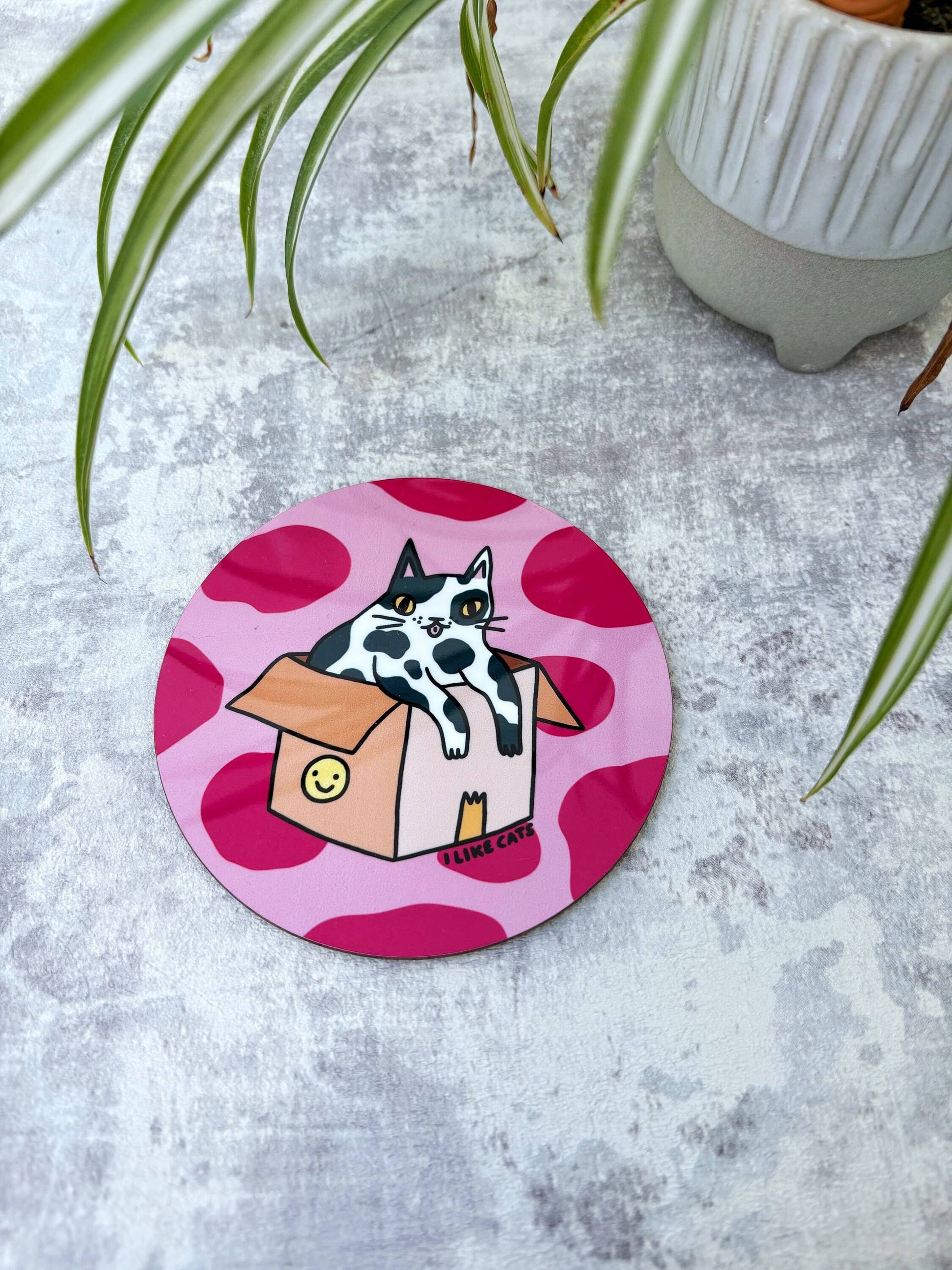 My illustration of a splodgy cat sitting in a box with a pink splodge background has been professionally sublimation printed onto a coaster, with a lovely gloss finish. They are really high quality and perfectly capture the vivid colours of my original drawing.