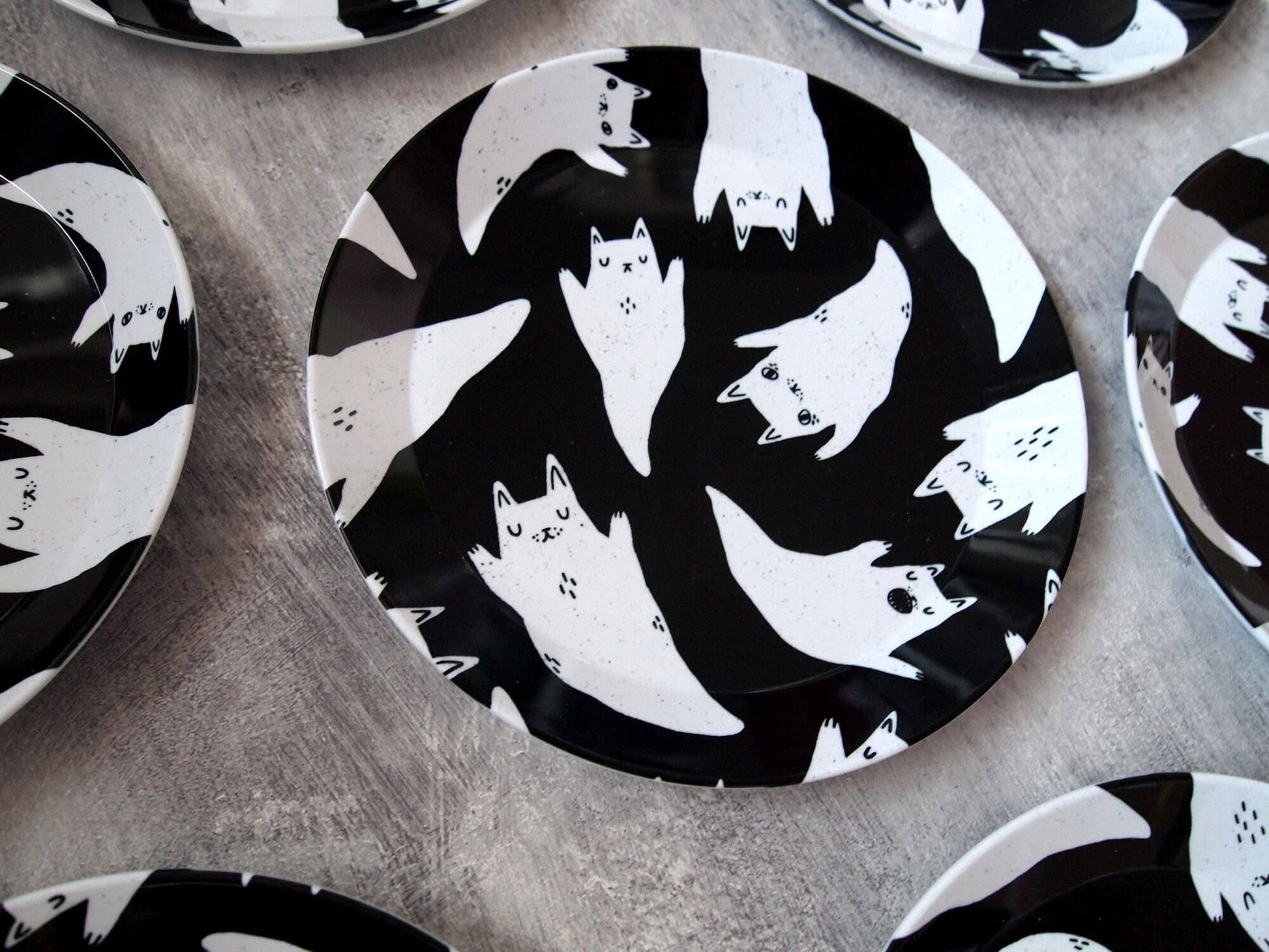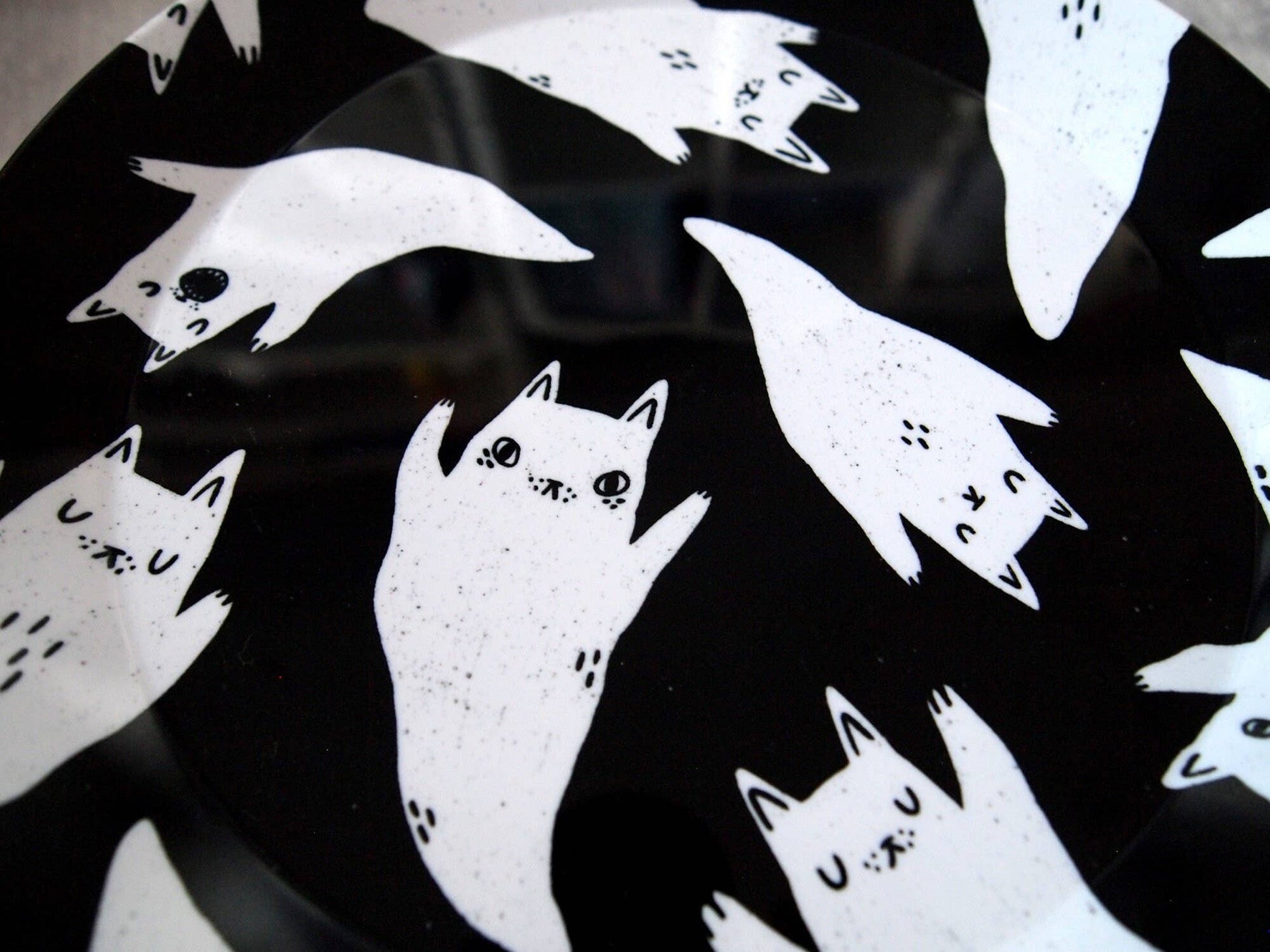 My original illustration of a group of friendly ghost cats has been professionally reproduced onto the plate, maintaining the beautiful vivid colours of my drawing.