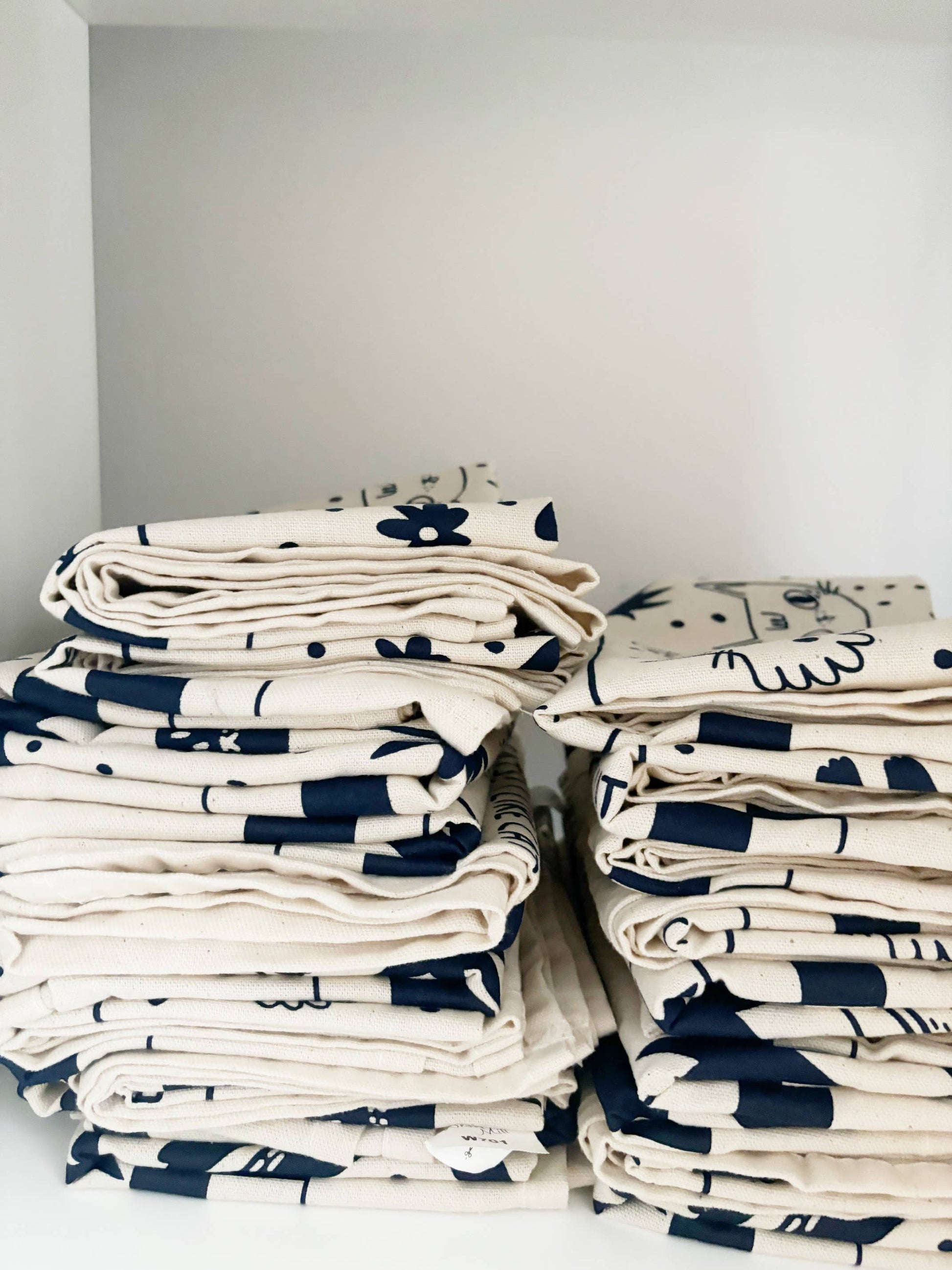 The tea towel is a natural colour 100% cotton with my design screen printed in gorgeous navy blue ink. It measures 48 x 71cm (19 x28 inches) with a loop on the back to hang on a peg or cupboard door.