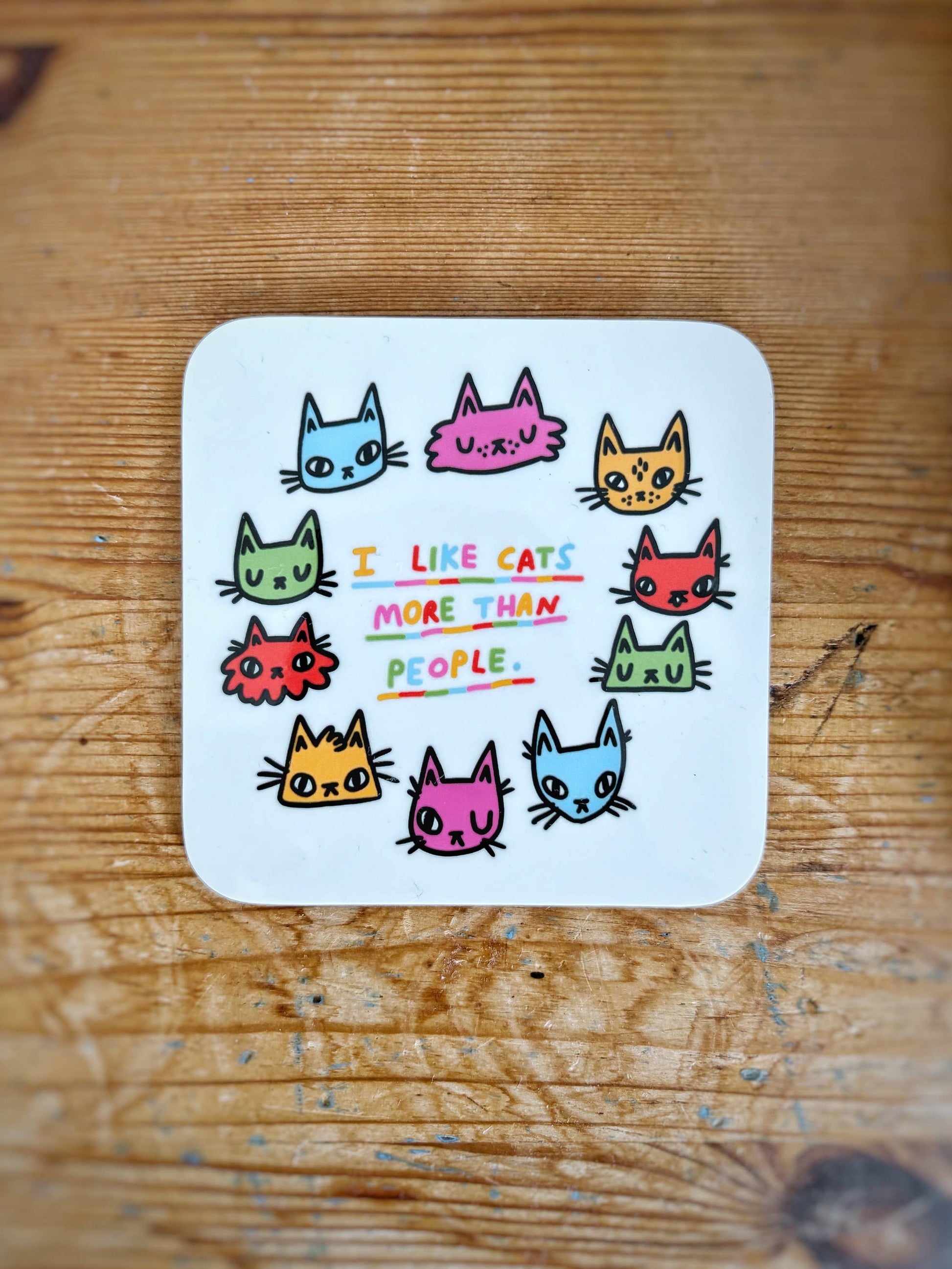 My illustration of colourful cat faces with the text ‘I like cats more than people’ has been professionally sublimation printed onto a coaster, with a lovely gloss finish. They are really high quality and perfectly capture the vivid colours of my original drawing.