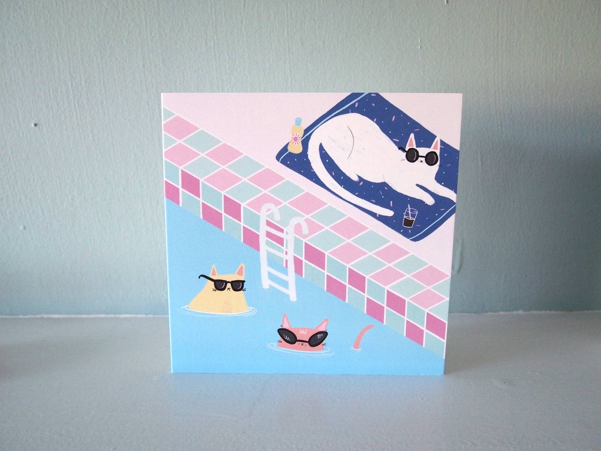 The perfect card for any cat lover, featuring my original illustration of some cats relaxing at the pool. It just makes me thinking of summer days, staying cool in the sun.