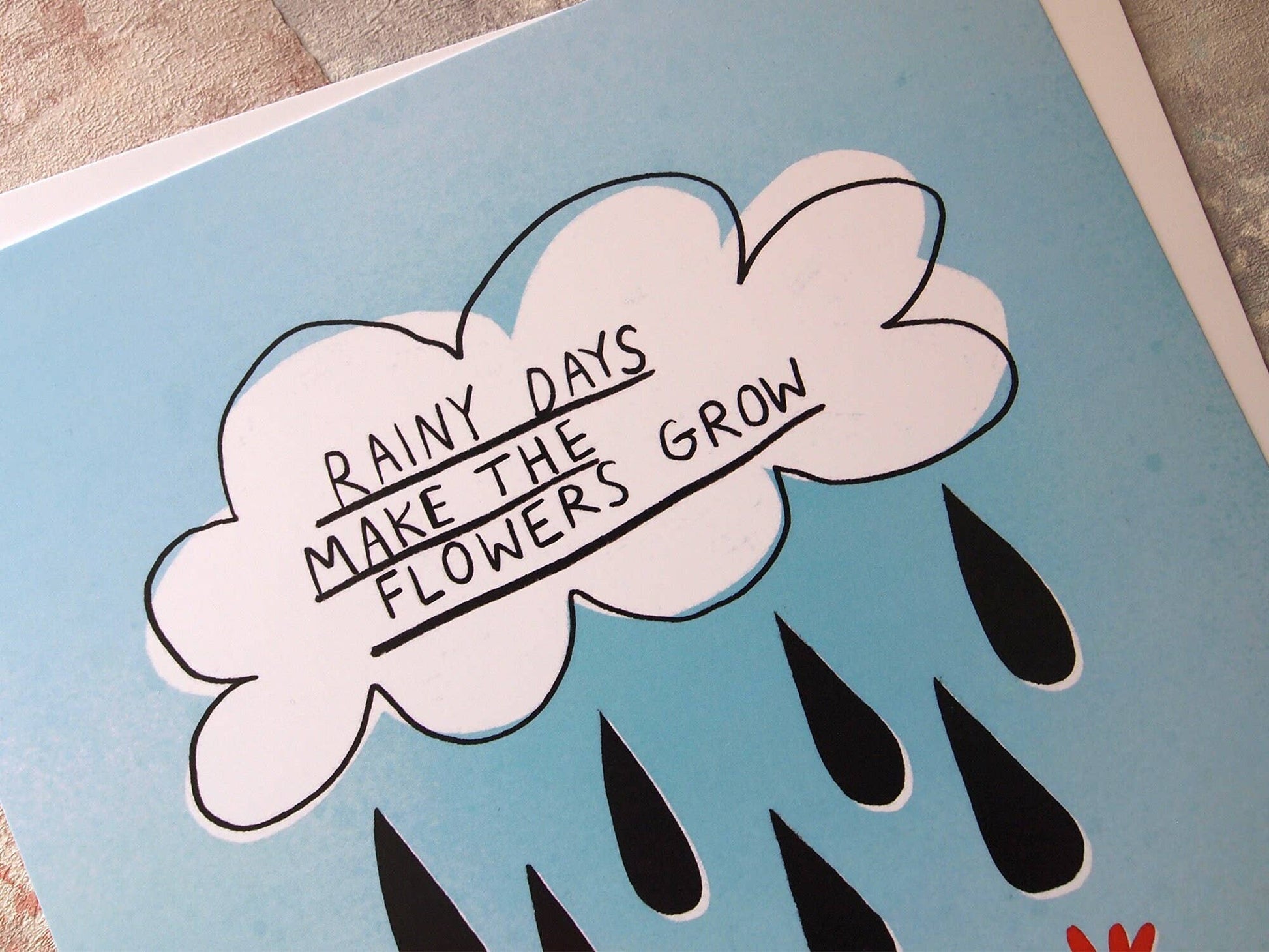 This print features my original illustration of black cats and flowers under a shower of raindrops with the inspirational quote 'Rainy days make the flowers grow'. Bold and graphic, this print makes a great addition to a room, whether in a home office, kitchen or even the bathroom.