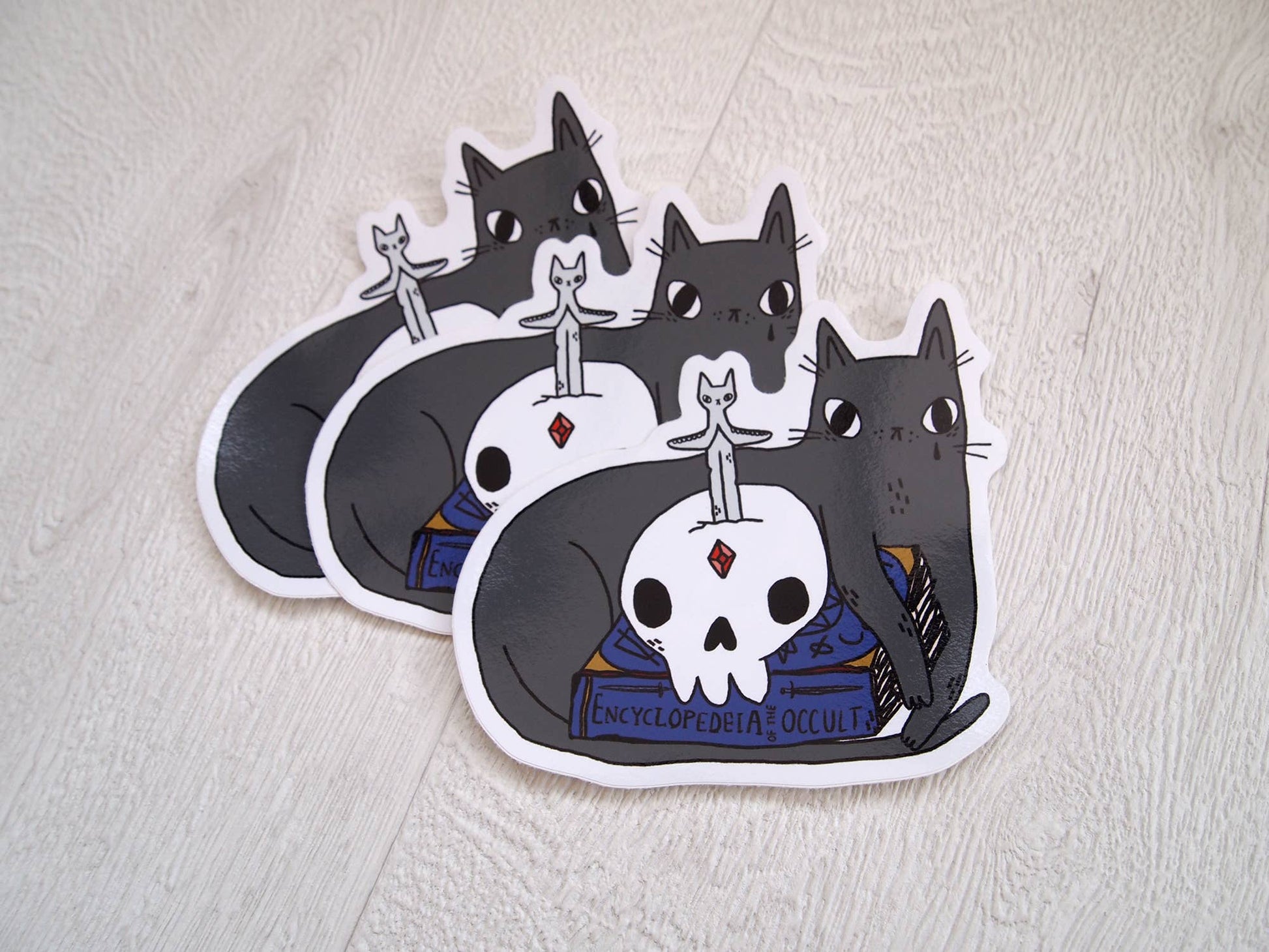 These stickers feature my illustration of a spooky black cat sitting on a book of the occult with a skull and dagger. This is based on a real book I found in my grandma's garage haha.