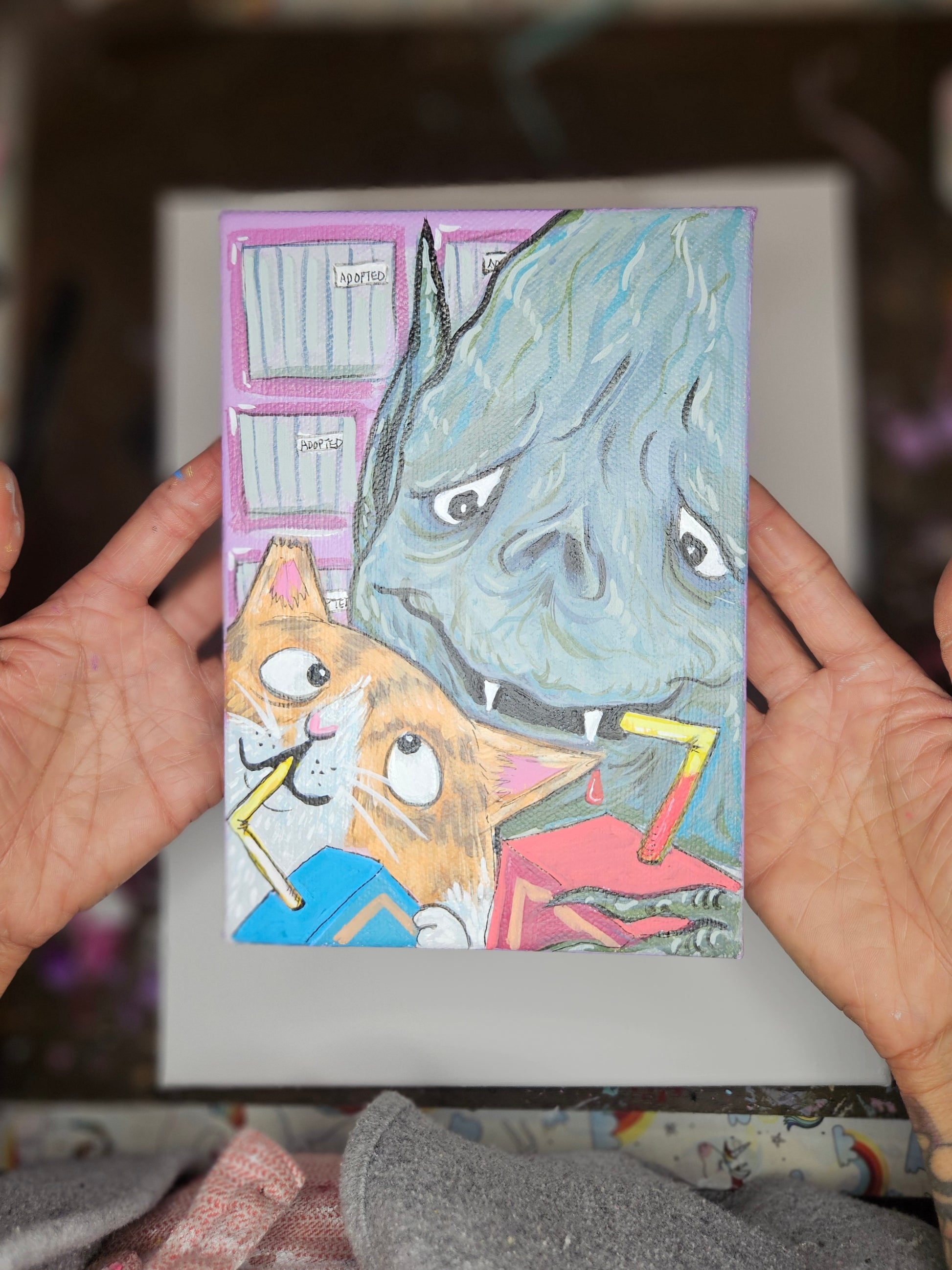 Original painting on 5x7" canvas by Kim O'Keefe from Virginia. 100% of the sale will be donated to TippedEars, the rescue that saved Juice Box! This sweet friendly girl is still looking for her forever home – apply to adopt or learn more here.