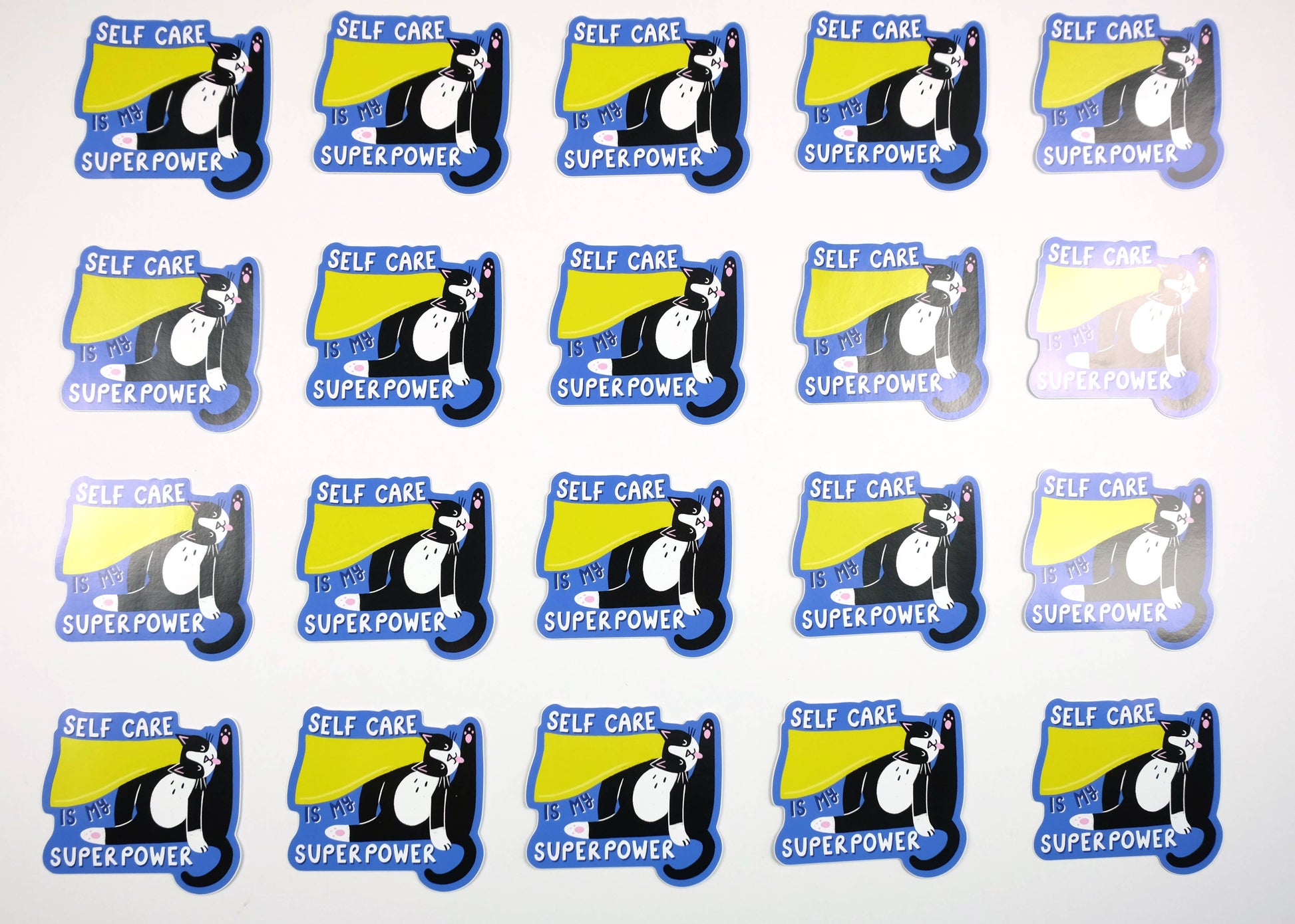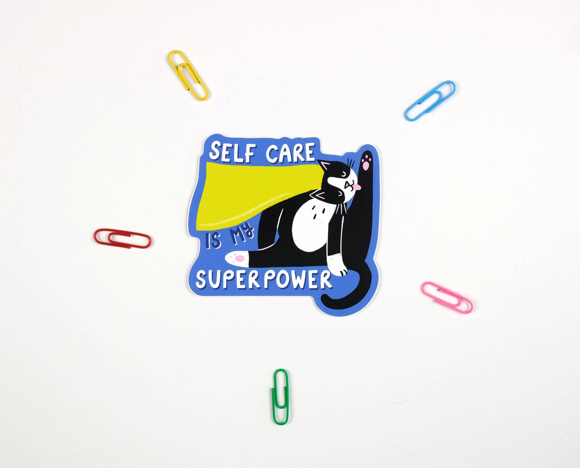 Decorate notebooks, laptop or iPad cases with this cute, colourful and fun gloss vinyl sticker! Cut in a custom shape and illustrated with a cute black a white cat with the slogan; 'Self Care is My Superpower'.