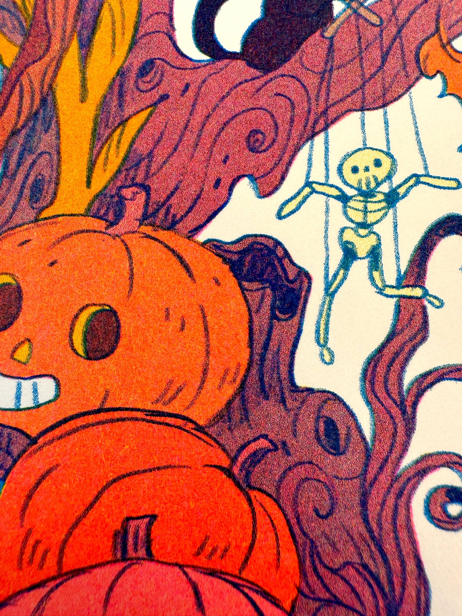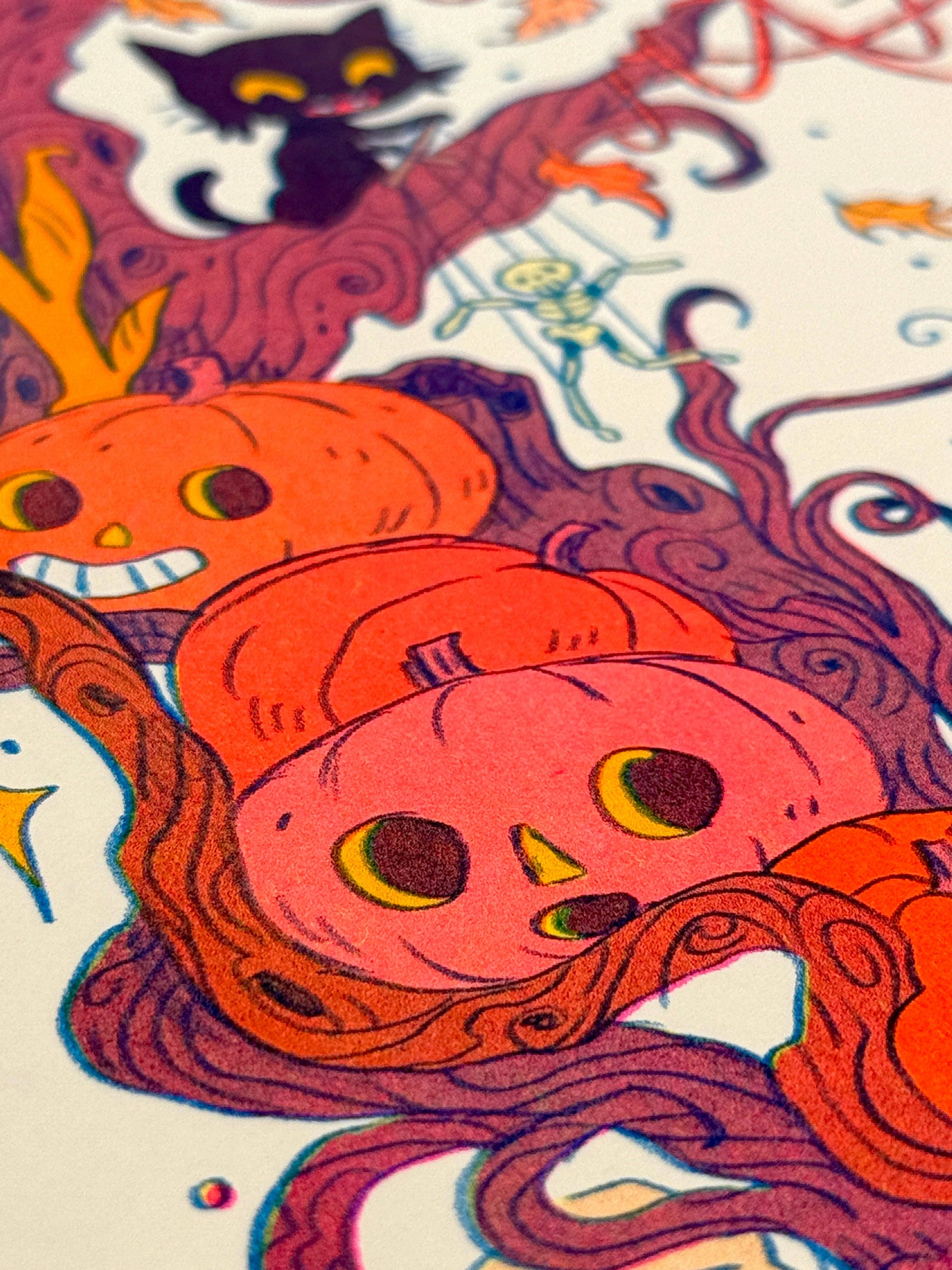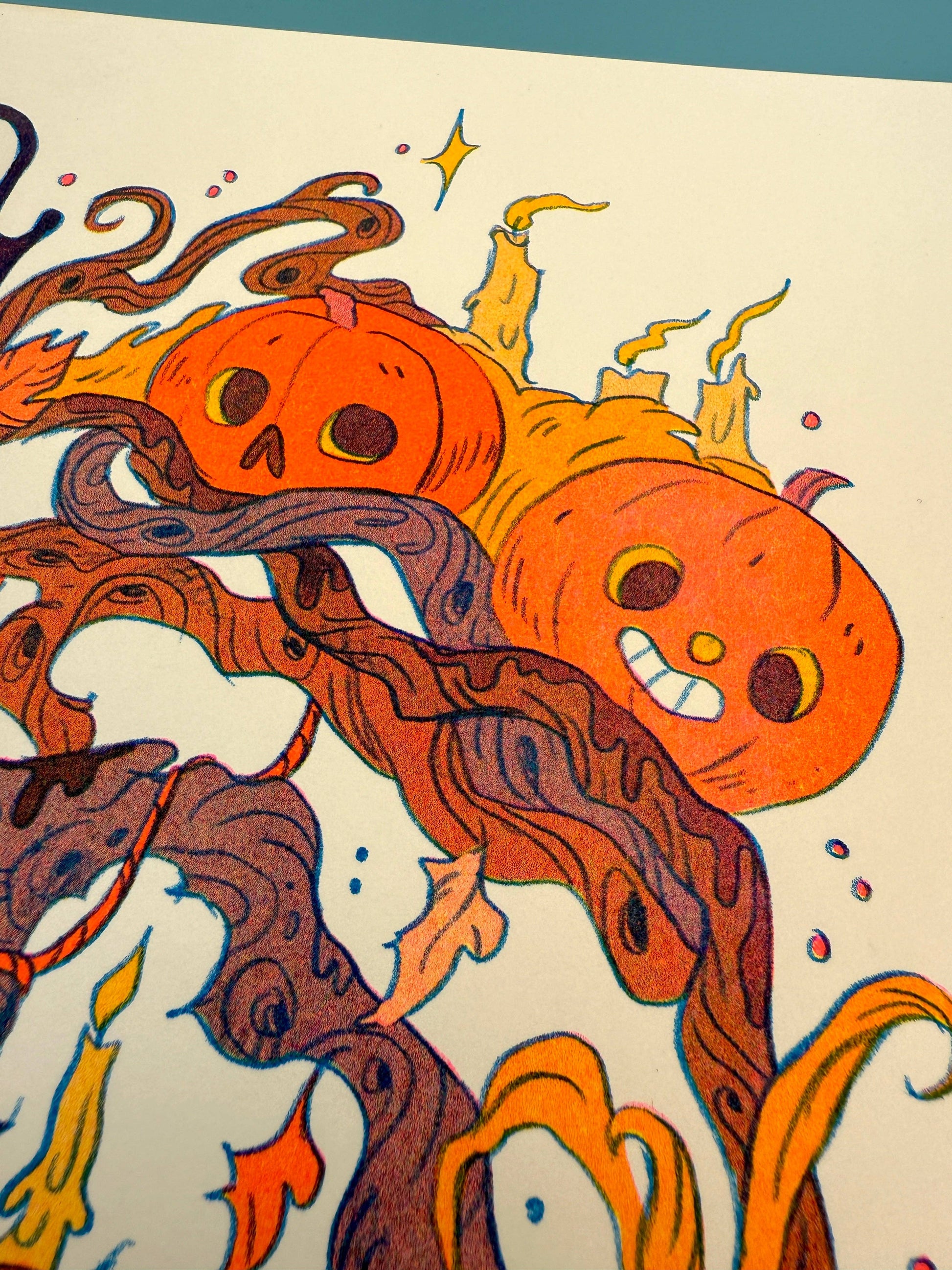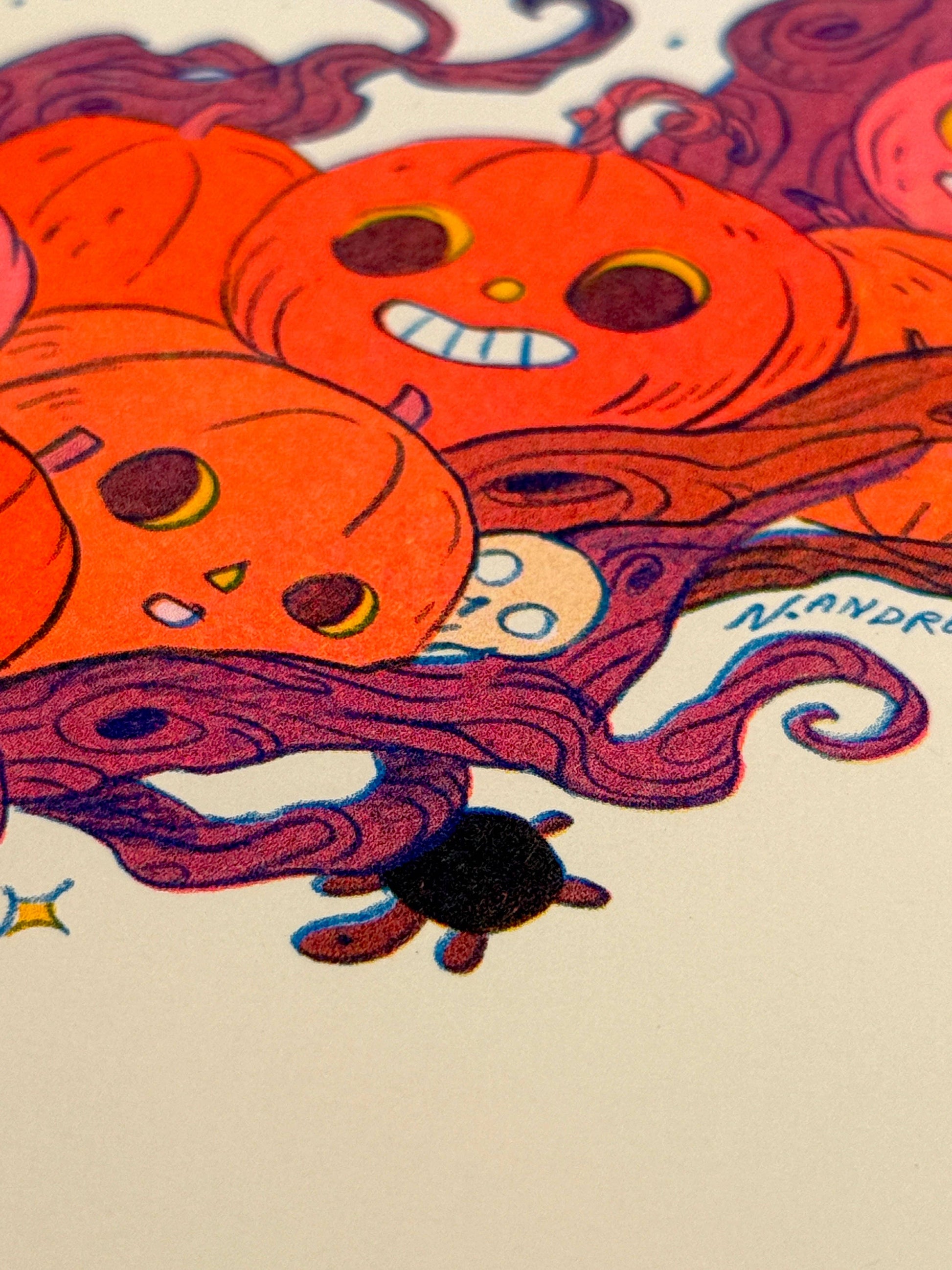This print has some visible roller marks inside of the print image because I used heavy fluorescent pink and yellows to create vibrant orange pumpkins. It doesn't interfere with the characters, just shows the process of the Riso! Just a heads up. I love that I was able to get such vibrant colors but the sacrifice is roller marks.