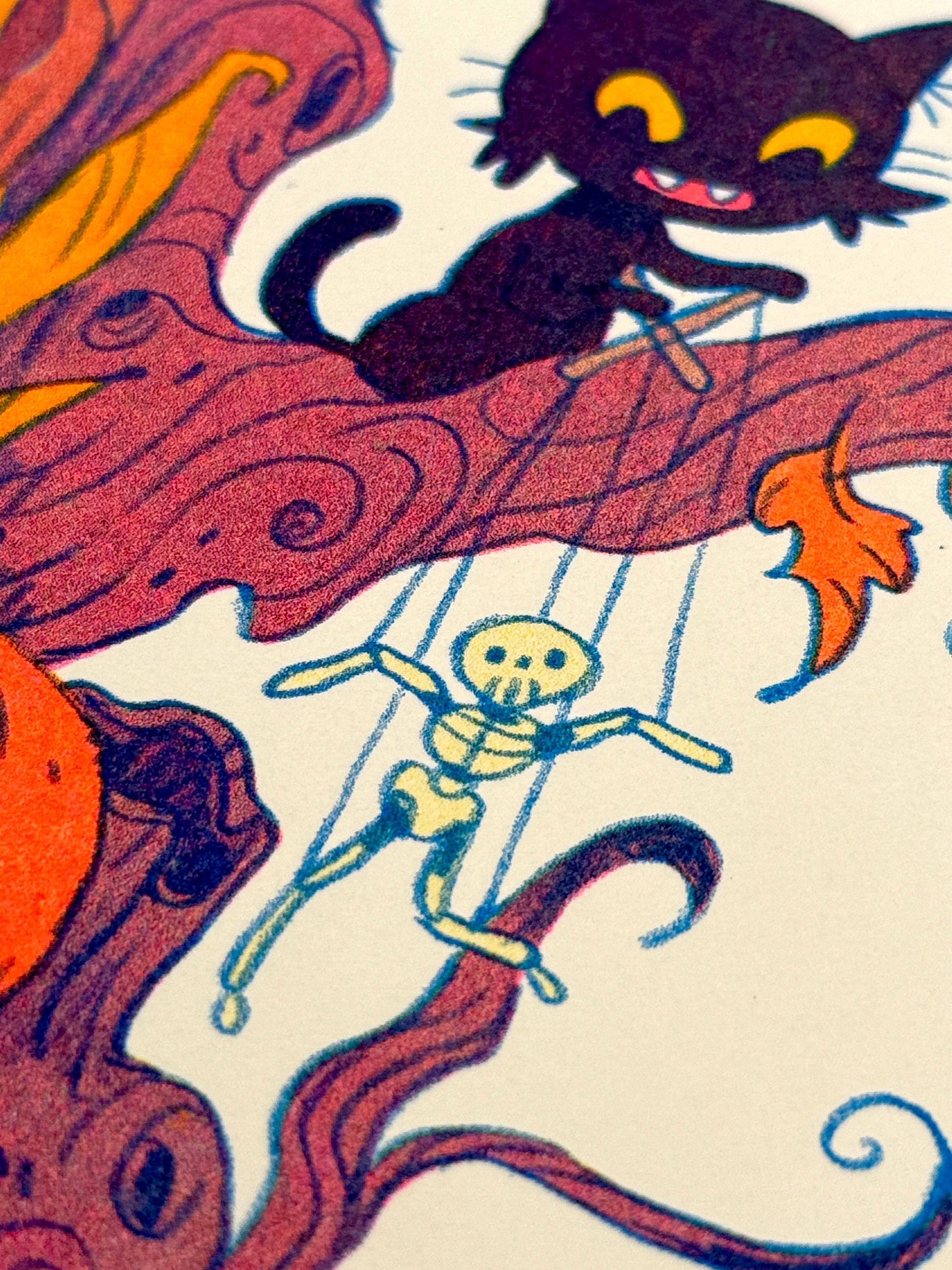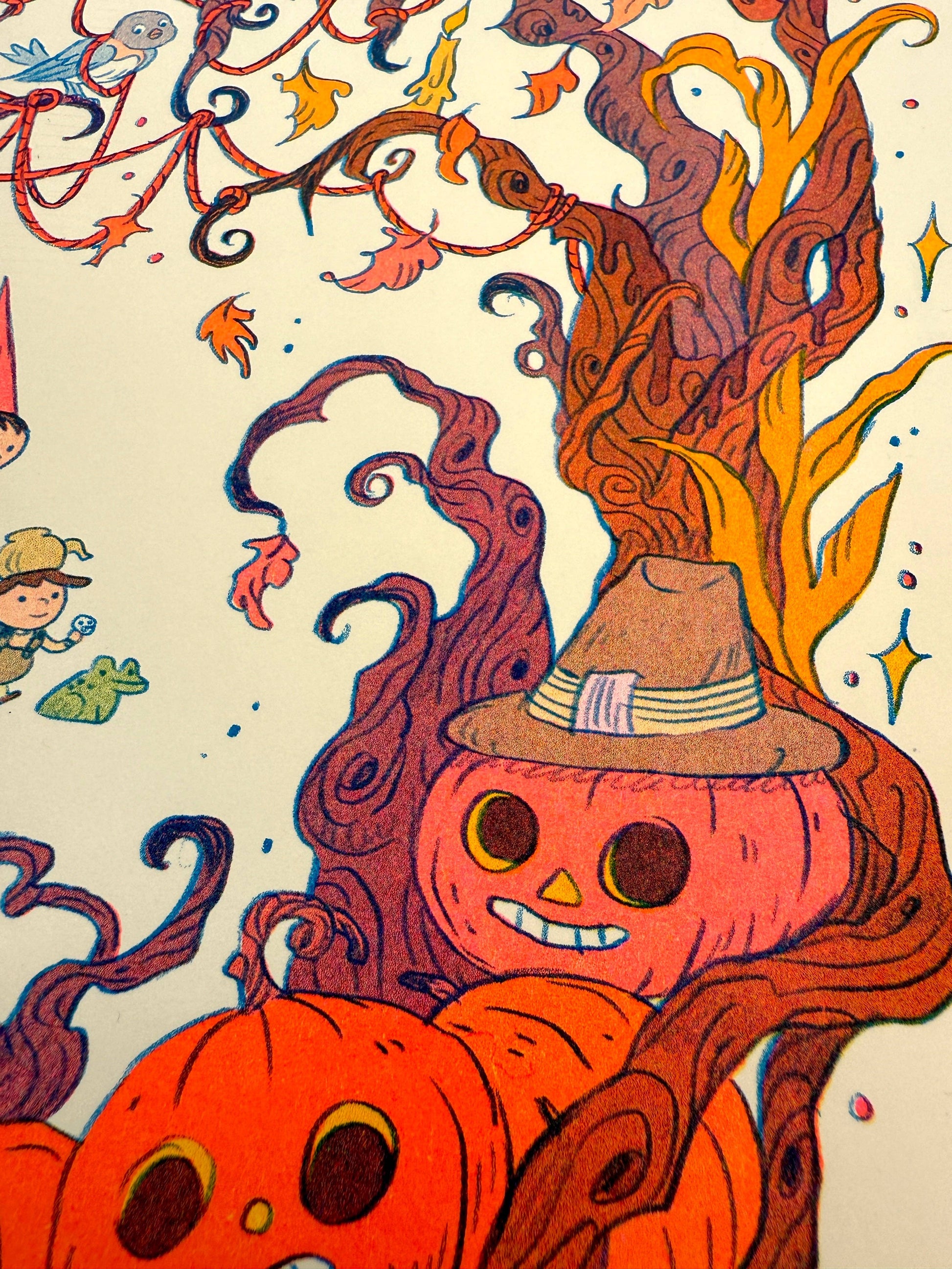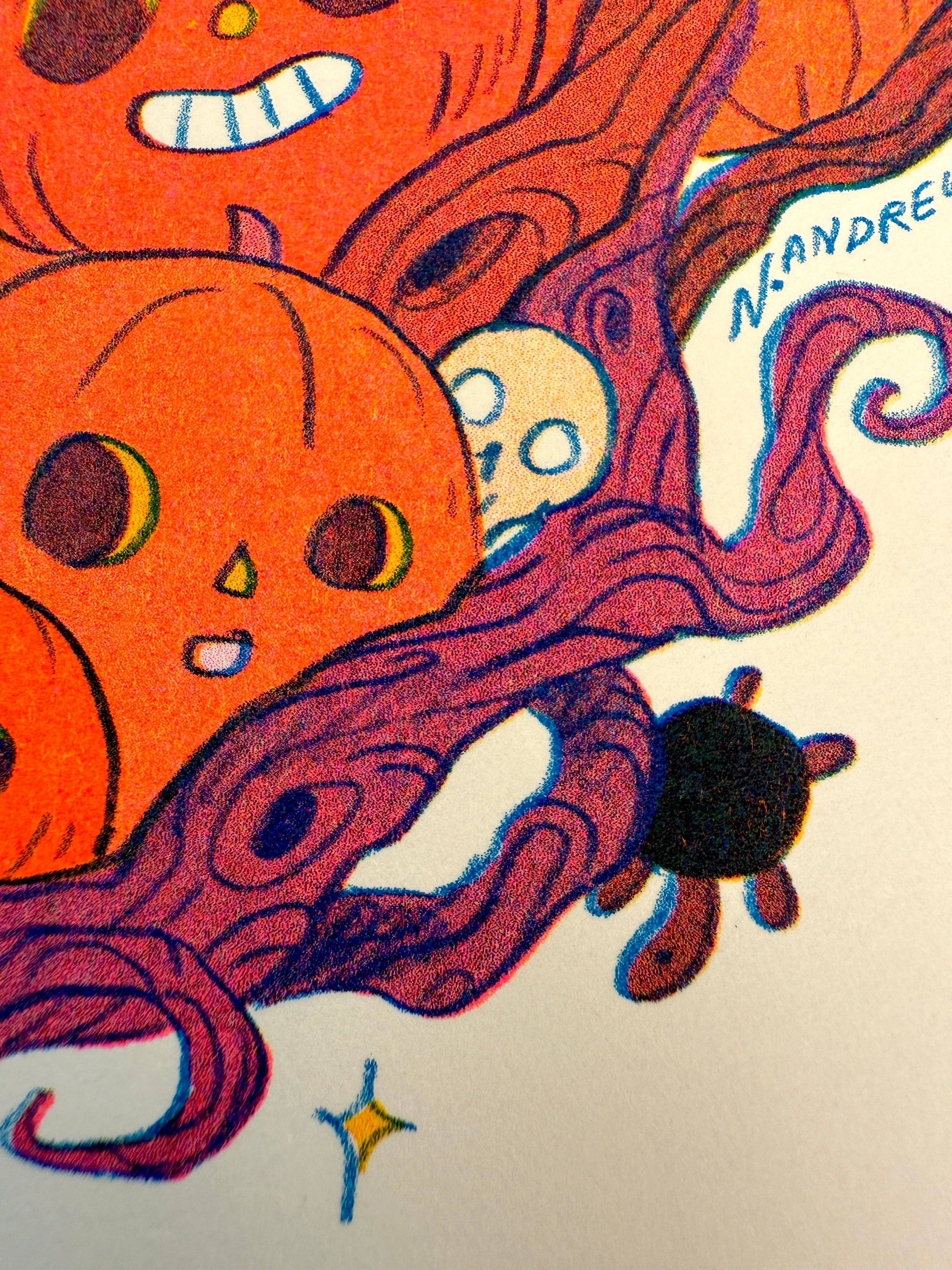 This print has some visible roller marks inside of the print image because I used heavy fluorescent pink and yellows to create vibrant orange pumpkins. It doesn't interfere with the characters, just shows the process of the Riso! Just a heads up. I love that I was able to get such vibrant colors but the sacrifice is roller marks.