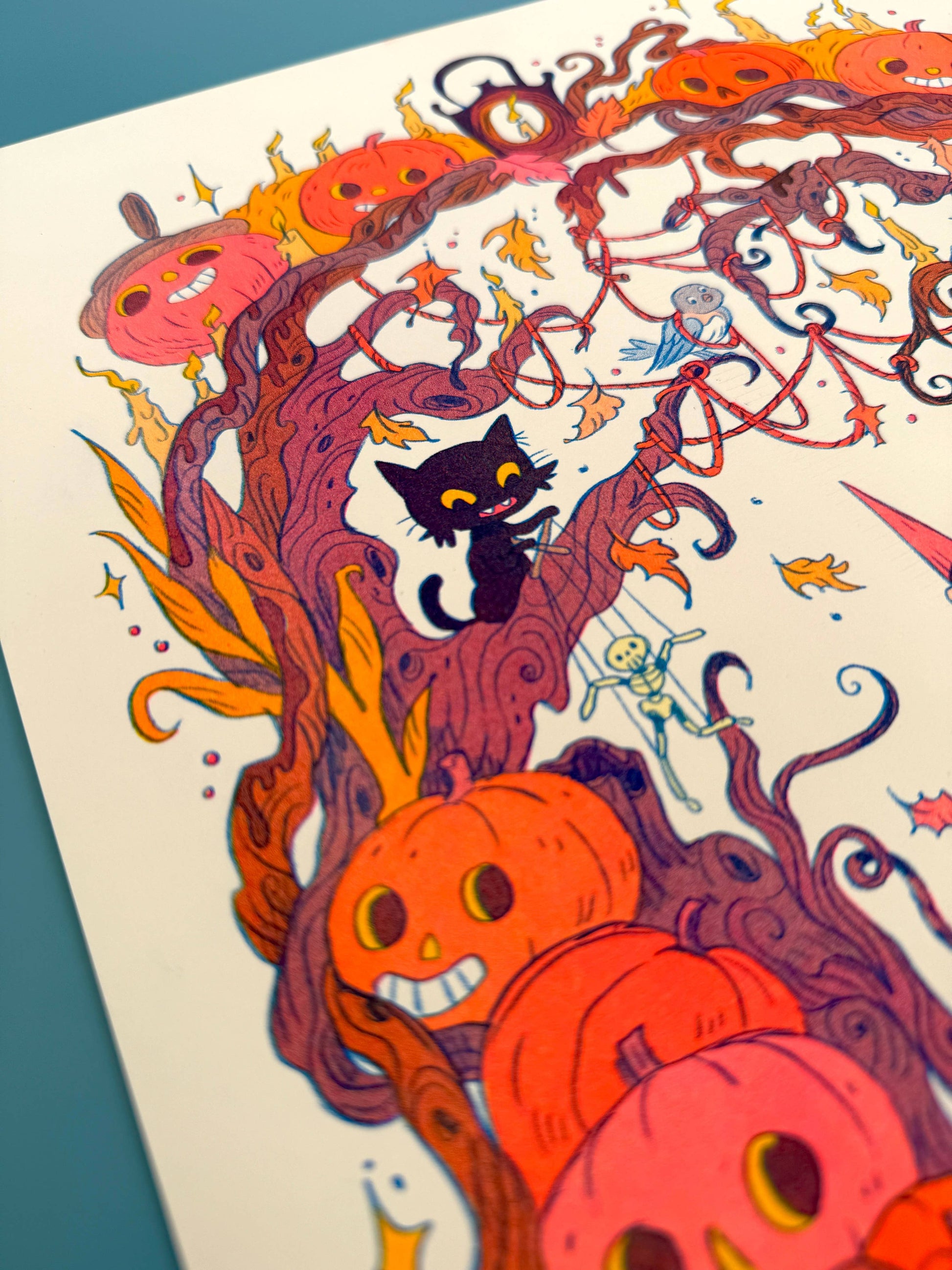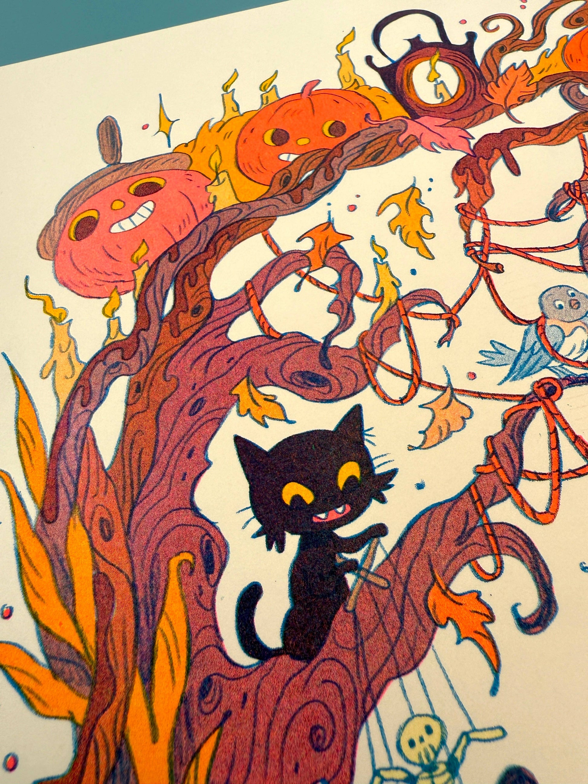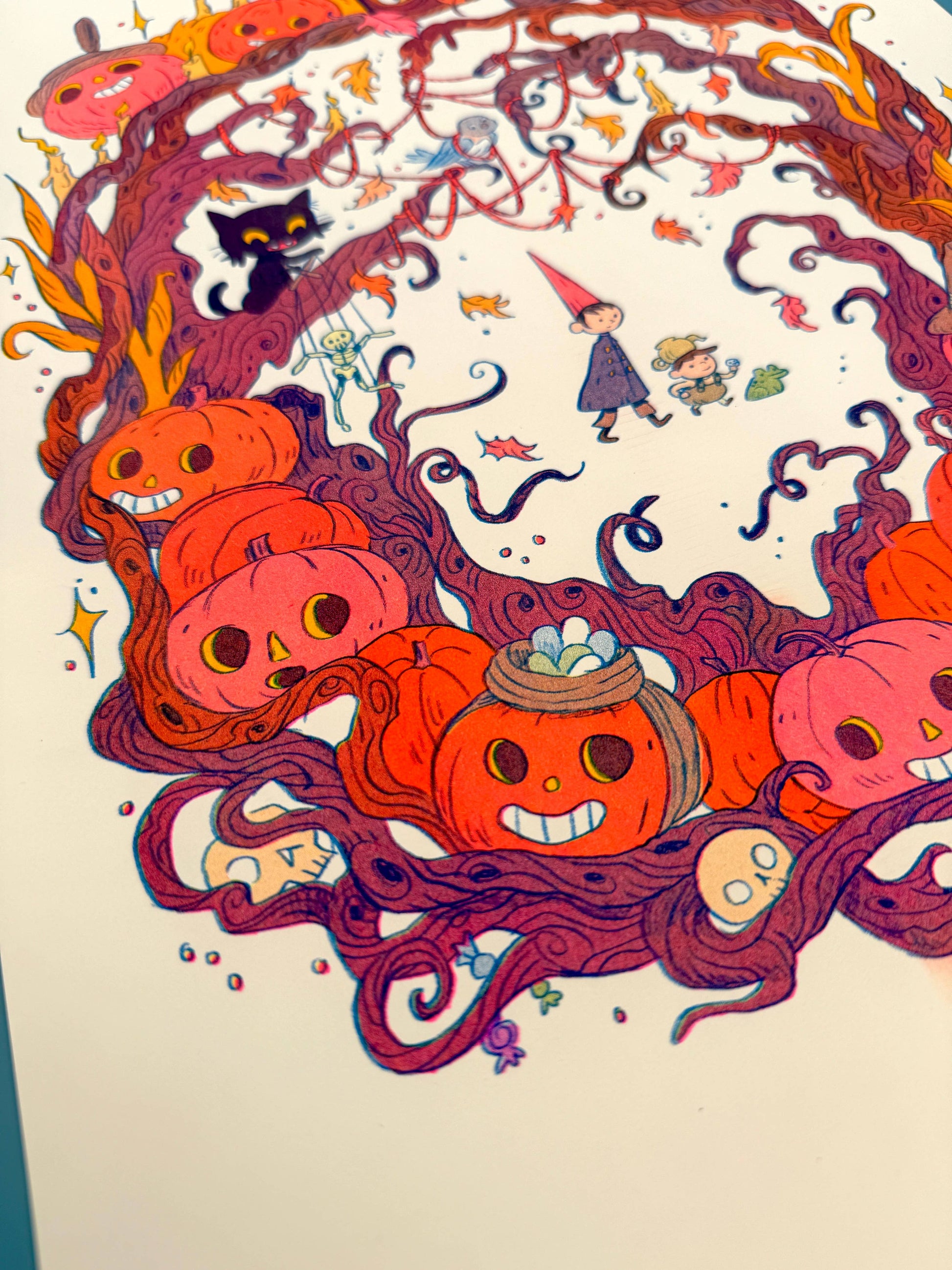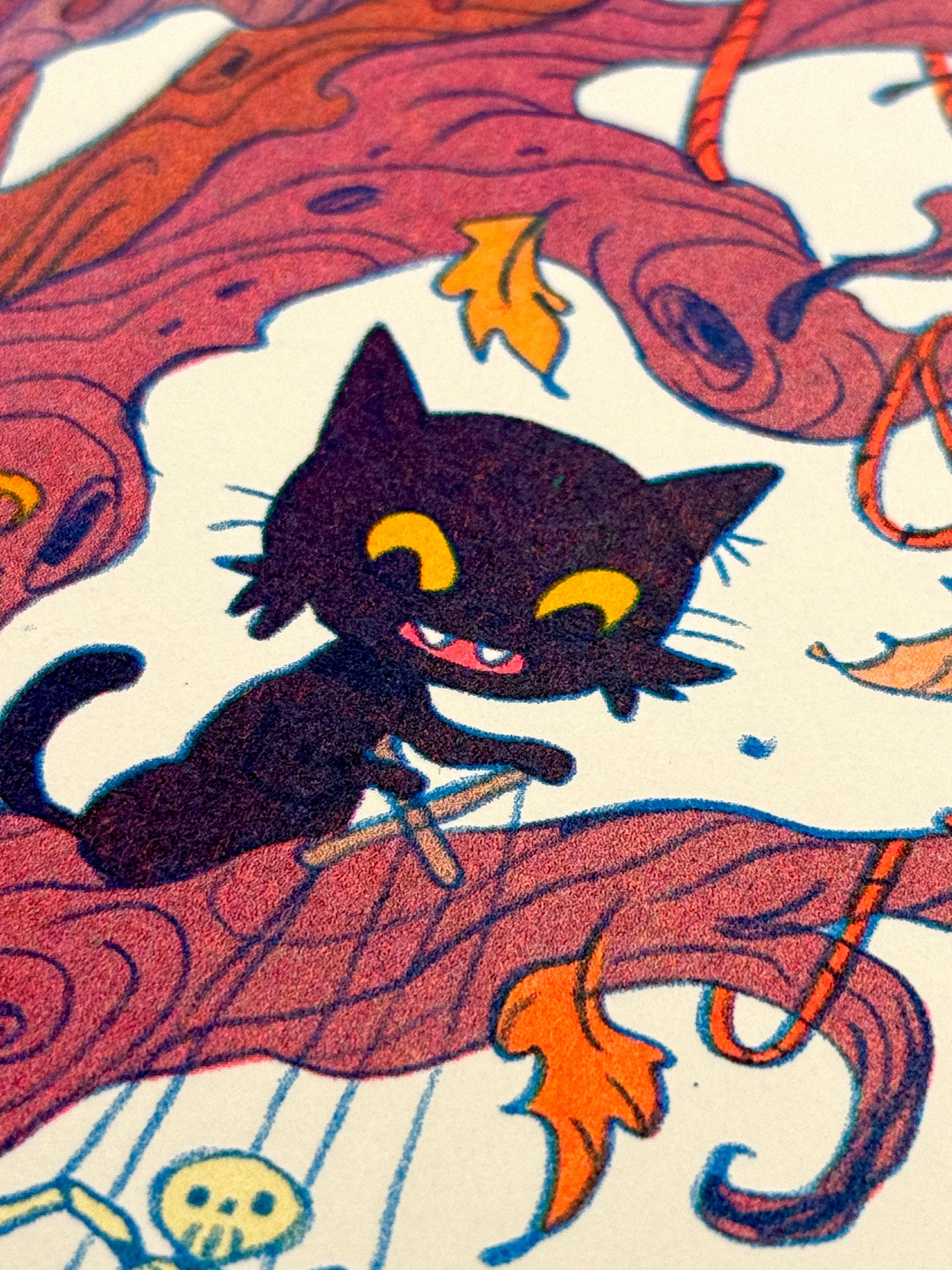 This print has some visible roller marks inside of the print image because I used heavy fluorescent pink and yellows to create vibrant orange pumpkins. It doesn't interfere with the characters, just shows the process of the Riso! Just a heads up. I love that I was able to get such vibrant colors but the sacrifice is roller marks.