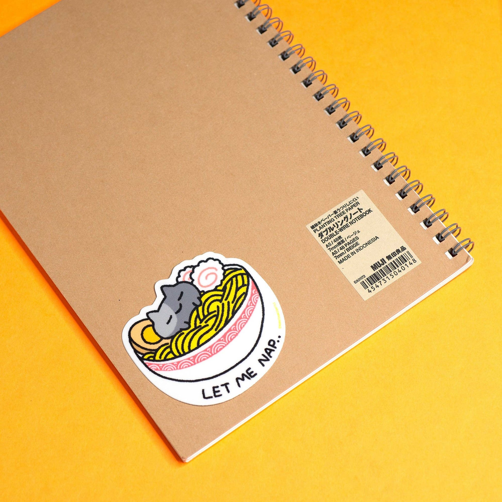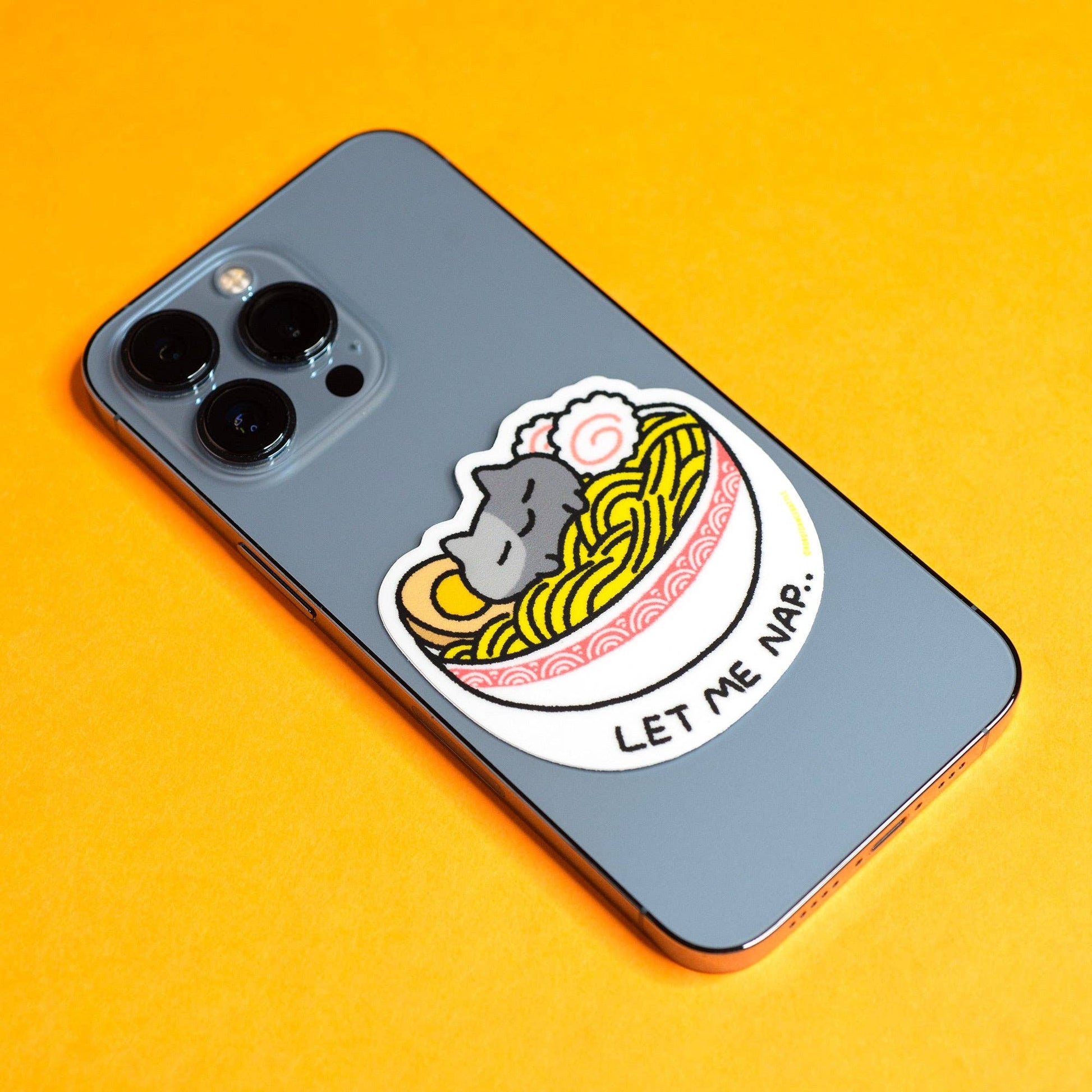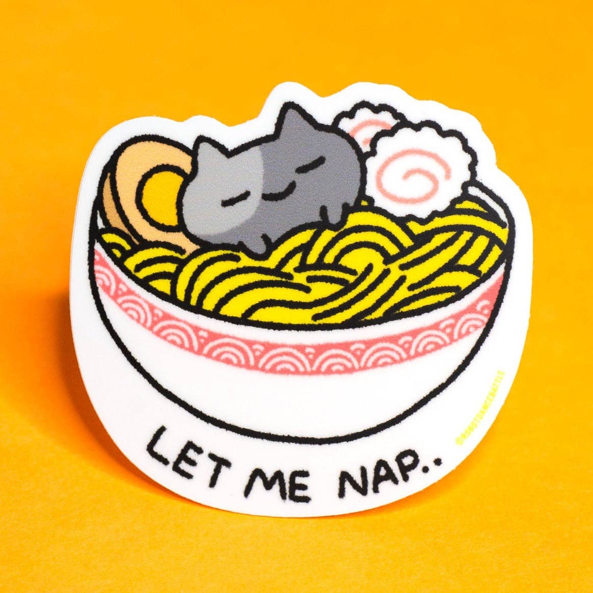 Just a sticker of a cat enjoying a nap in a bowl of ramen.