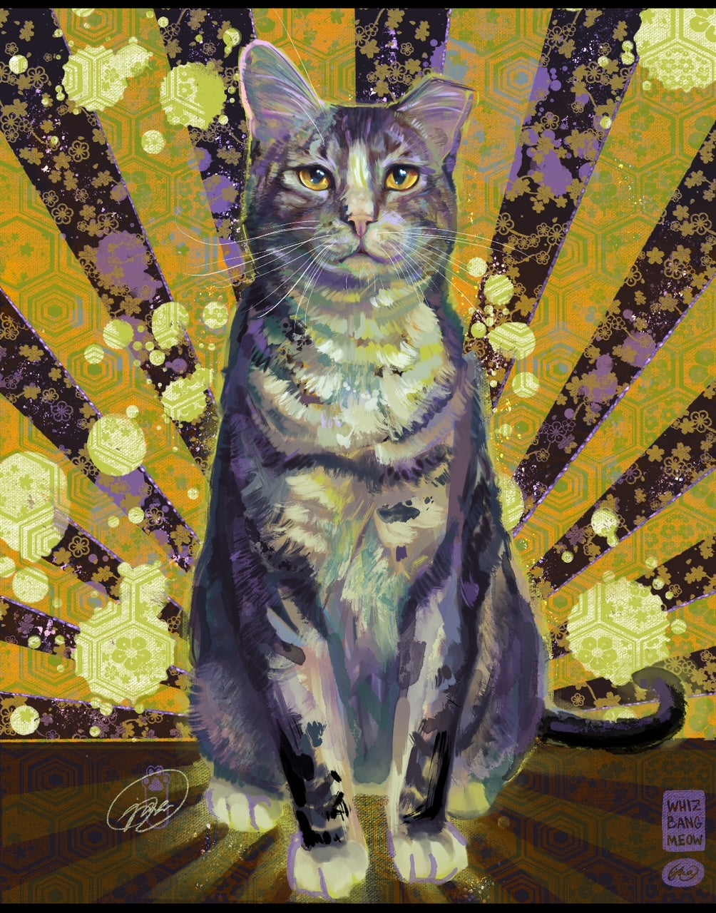 Artist bio: Whizbang Meow paints cats in all their contradictory glory: dignified, chaotic, and criminally cute. Their tradigital portraits blend lifelike detail with bold color & dynamic backdrops to celebrate the art of feline mischief, striking a balance of realism & abstraction with the grace of a cat zooming from the kitchen with a chicken nugget.