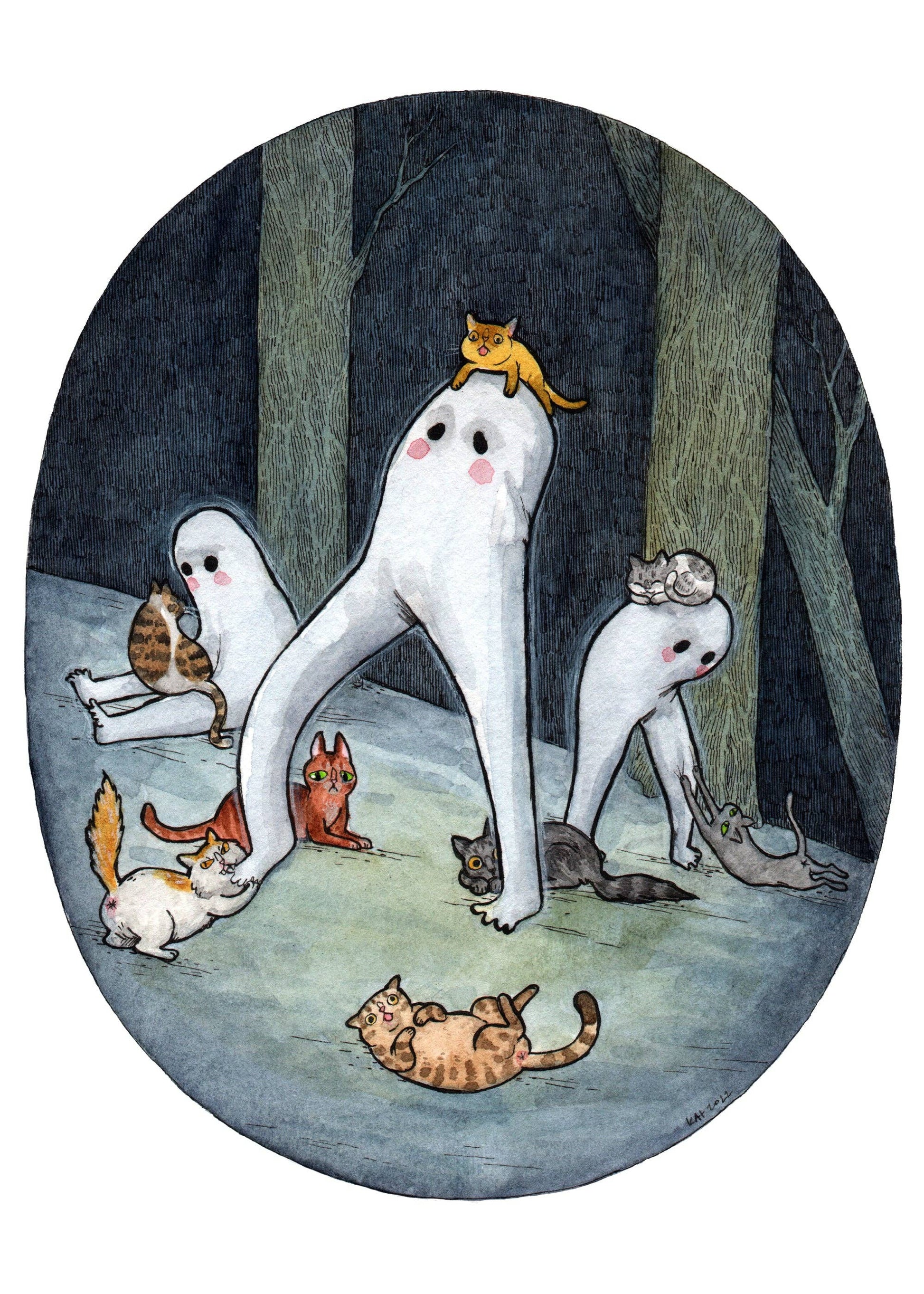 "Fresno Nightkittens" Life is hard when you're a Fresno Nightcrawler, like what even are you? An alien weirdo? Ghostly pants? Existential questions aside, the worst part is you don't even have arms to pet your favorite kitty companions. But they do their best and the cats love them anyway. A continuation of the Horror Cats series, these cryptids with cats pieces imagine some of America's favorite elusive legends as feline enthusiasts. Life can get lonely out there when everyone thinks you're imaginary, but the cats don't mind.