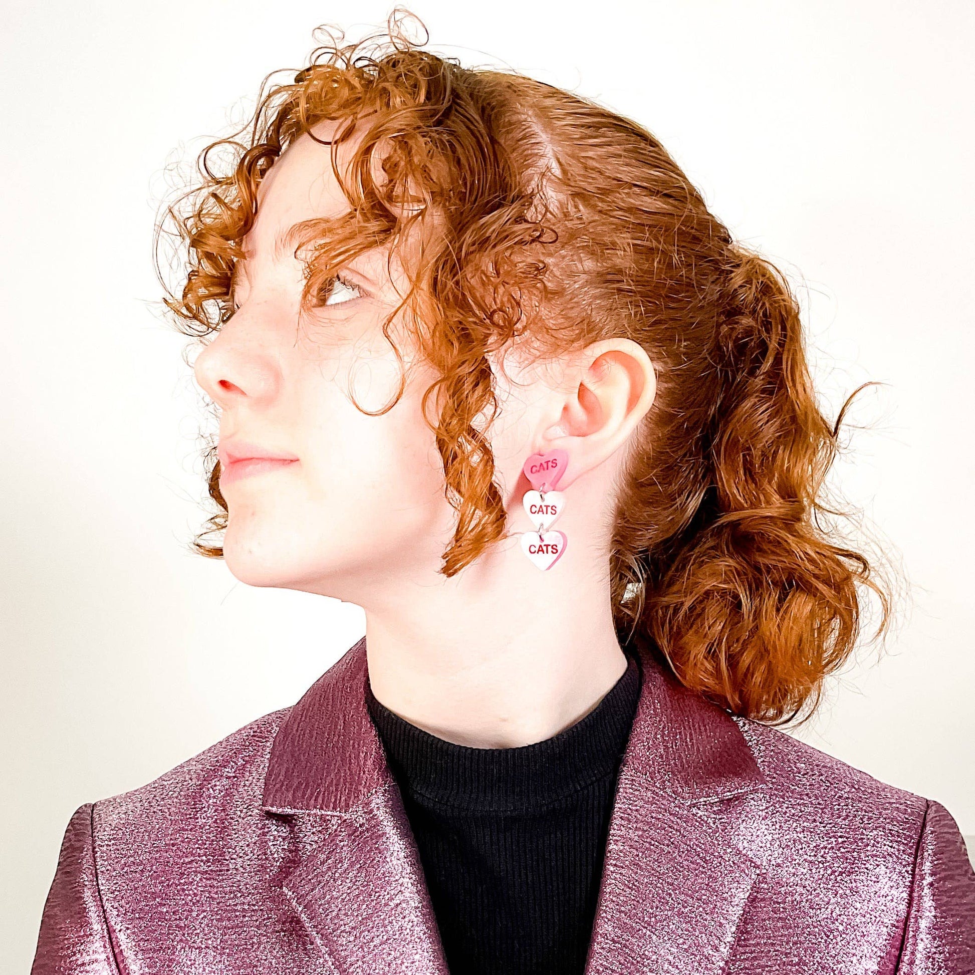 Here's one for all you cat lovers out there. Someone get NECCO on the phone and tell them to make the candy version of these STAT! This design is our inedible version of the Valentine's Day candy. These earrings are our post dangle style earrings with 'Cats' etched onto each candy heart design. Adorable, sweet, but not sweet enough to eat. They are comprised of pink and white plastic! Earrings are sold as a pair. Acrylic (plastic) charms. Silver plated jump-rings. Surgical steel posts.